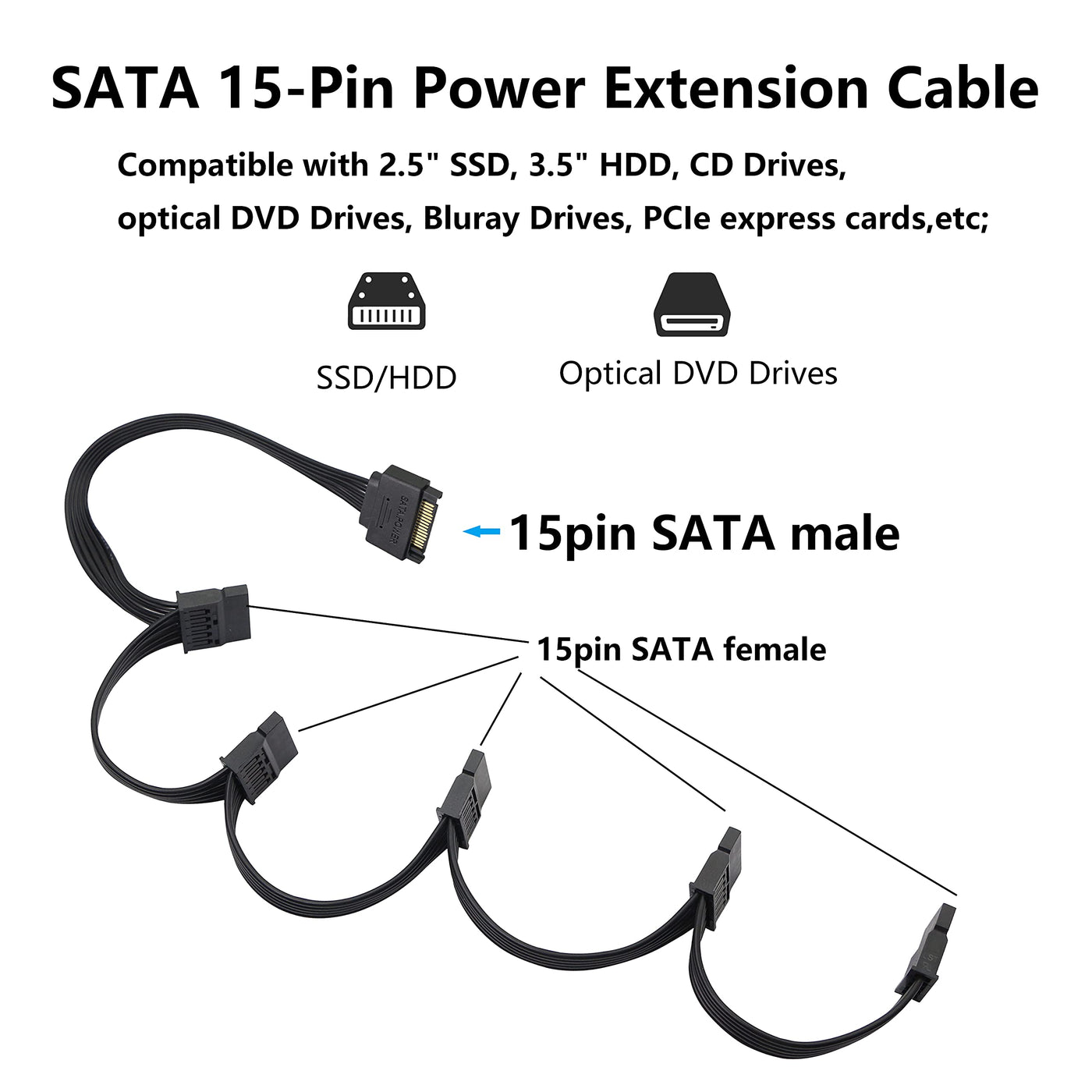 15 Pin Sata Male 1 To 5 Female Sata 15Pin Splitter Power Cable Cord For Pc Hard Drive Product Function: Connect A 15Pin Male Plug, Turn Out 5 Sata 15Pin Female Heads Specifications: Easily Add This Cable Adapter To Your Computer Connectors And Be Able To Provide Power For Sata Drives. Each Sata Power Connector Is Spaced About 3.9 Inch In Addition, Multiple Drives Can Be Easily Connected In Parallel To One Power Cable. Material: Copper Wire Features: Durable, Easy To Use, Plug And Play, Computer Accessories Length Of Each Volume: Cm +Cm + Cm+Cm+Cm Package Included: 1 X 15Pin Sata Male 1 To 5 15Pin Sata Female Splitter Cable
