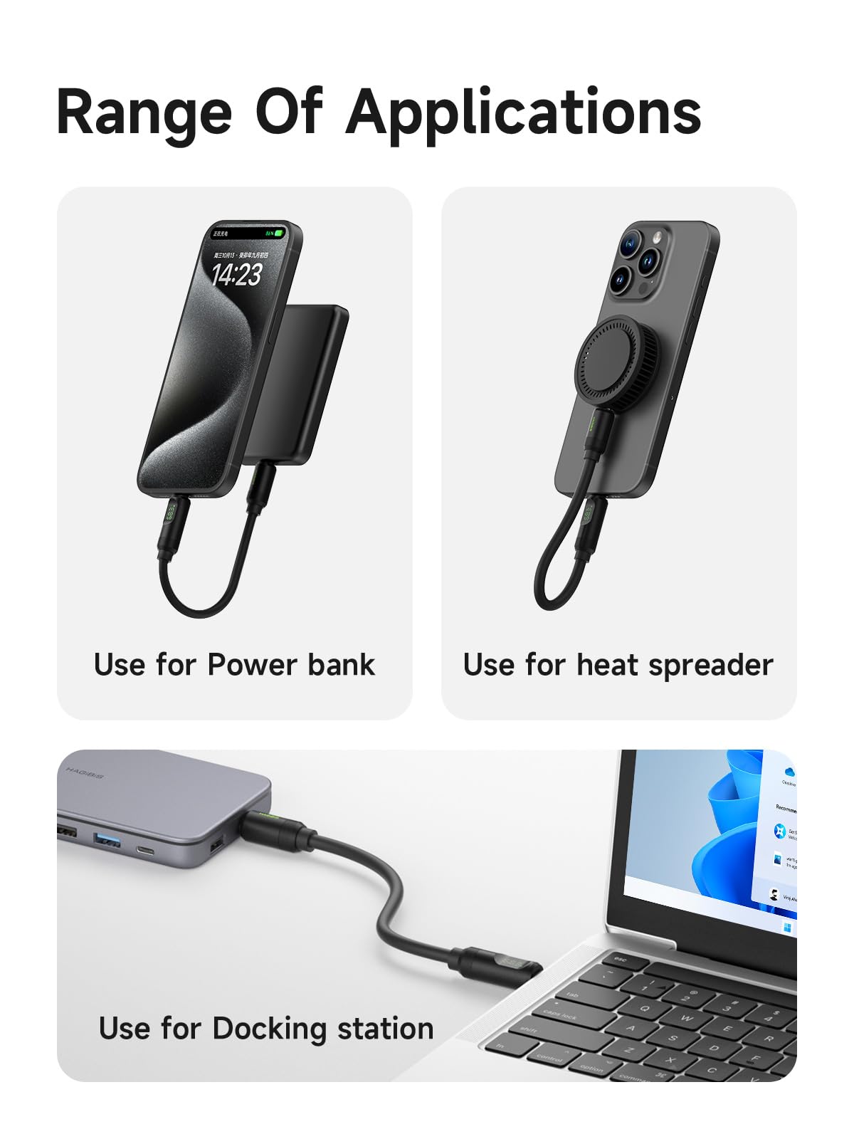 Q: What devices are compatible with the Hagibis USB 4 Cable?A: The Hagibis USB 4 Cable is compatible with a wide range of USB-C devices, including the latest iPhone models (16, 15 Pro Max, 15 Plus), MacBook Pro and Air, iPad Pro/Mini/Air, and various laptops such as Dell XPS and Galaxy Tab S8/S8 Plus.