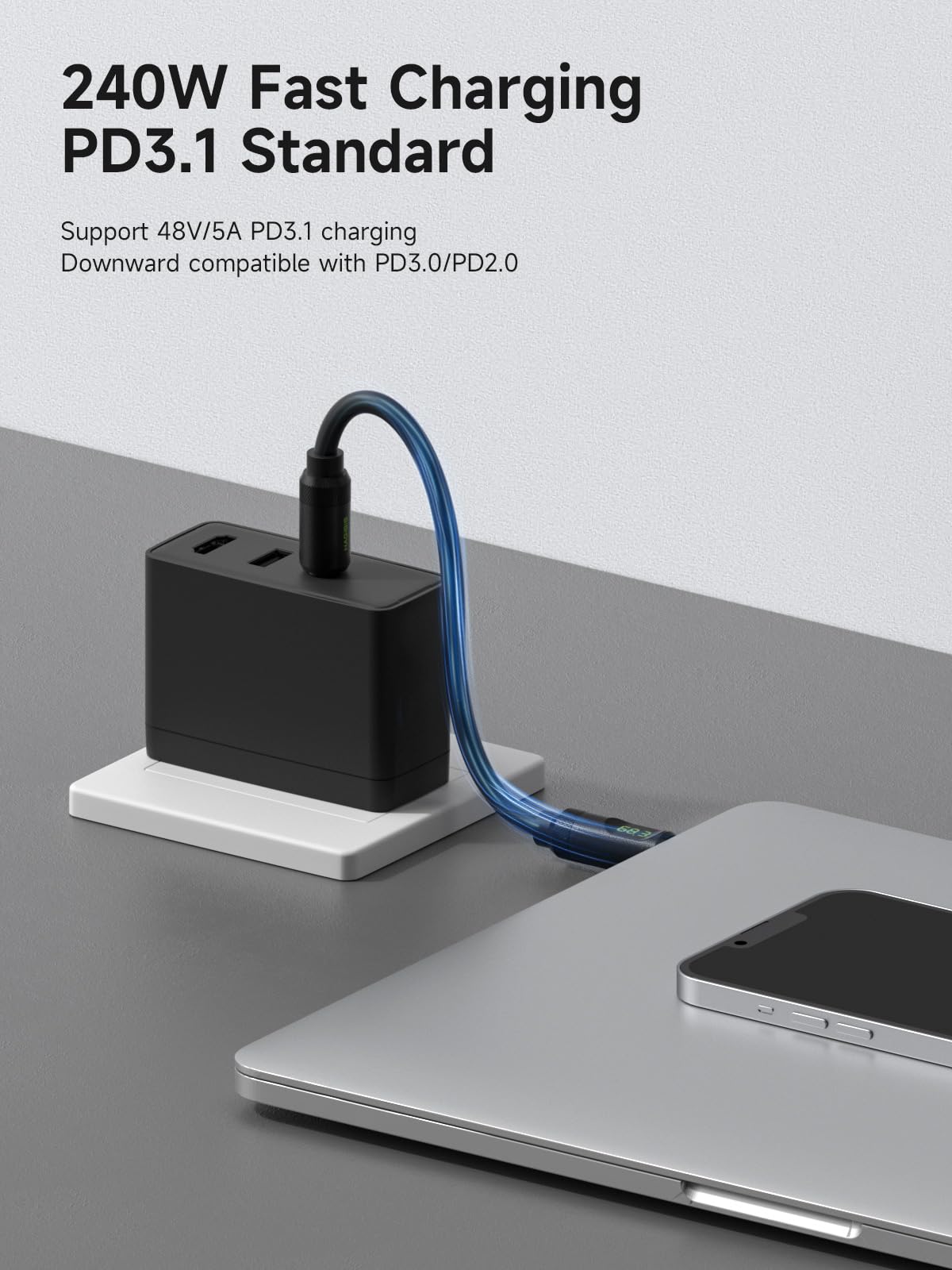 Q: What is the maximum charging capacity of the Hagibis USB C cable?A: This cable supports fast charging at speeds of up to 240W (48V 5A), making it suitable for charging a wide range of devices, from smartphones to laptops, while being compatible with PD3.1 and older protocols.