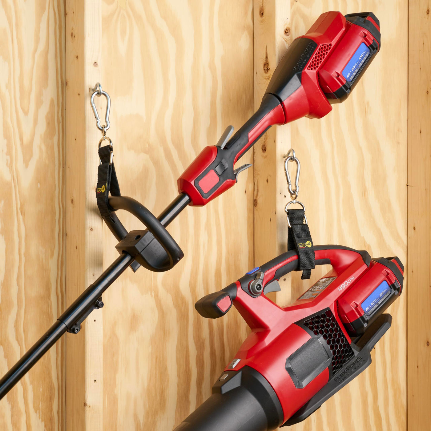Q: How do I use the Hook 'n Hang storage straps for extension cords?A: To use the Hook 'n Hang storage straps for extension cords, simply wrap the strap around the coiled cord and secure it using the heavy-duty hook and loop design. This will keep your cords organized and tangle-free.