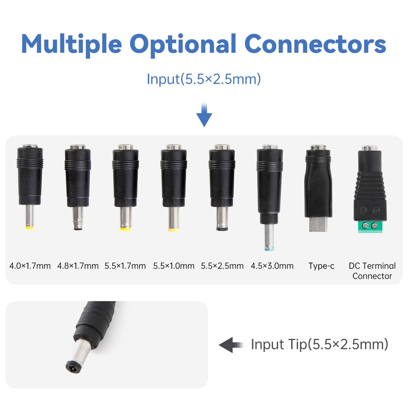 Q: What types of tips are included with the HZHFCB Power Supply?A: The power supply comes with an original 5.5x2.5mm tip and 8 frequently used tips to help connect a variety of different devices.