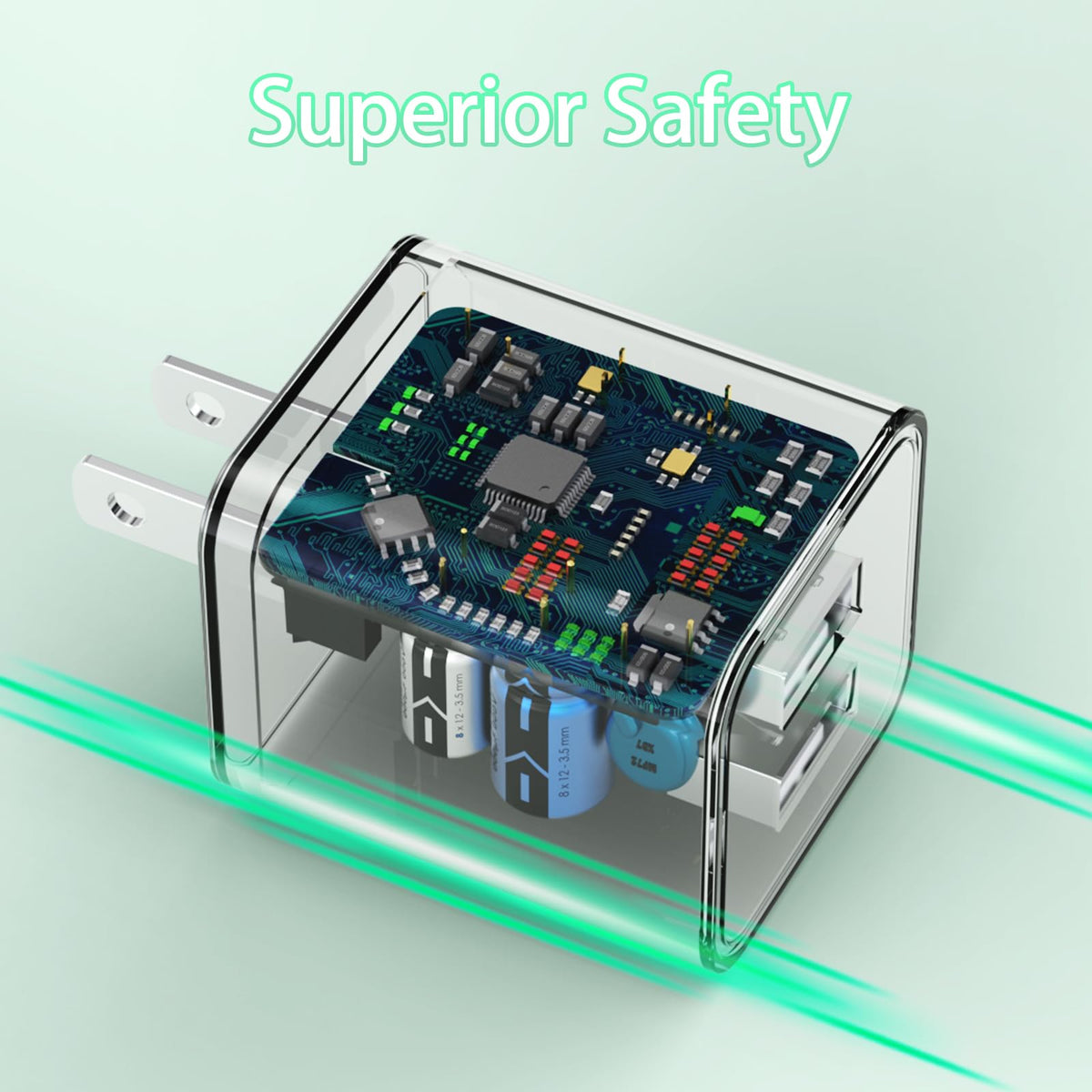 Q: Is the charger safe to use overnight?A: Absolutely. The intelligent chip inside the charger automatically matches the current to your device's needs, providing multiple protections against over-current, over-voltage, over-heating, and short-circuit, ensuring safe charging even overnight.