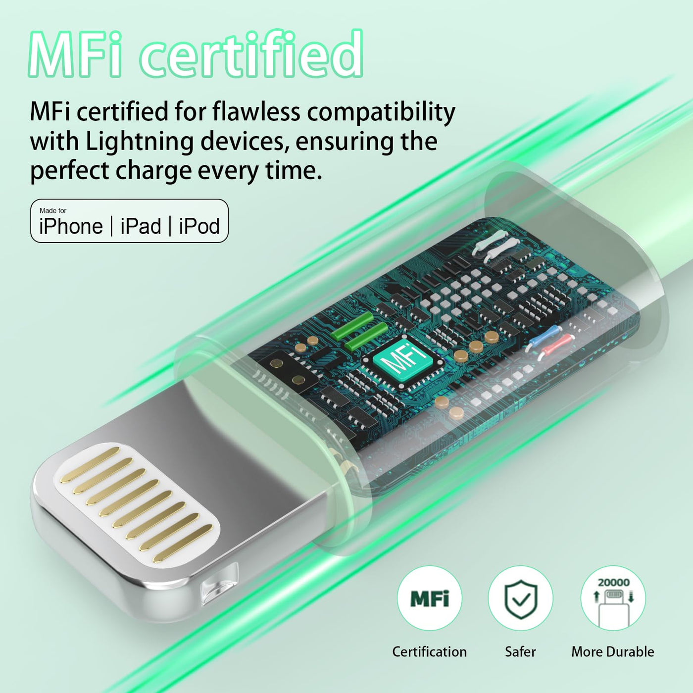 Q: How long is the Lightning cable included with the charger?A: Each charger pack comes with a 6FT Lightning cable, providing extra length for convenient charging while using your device.