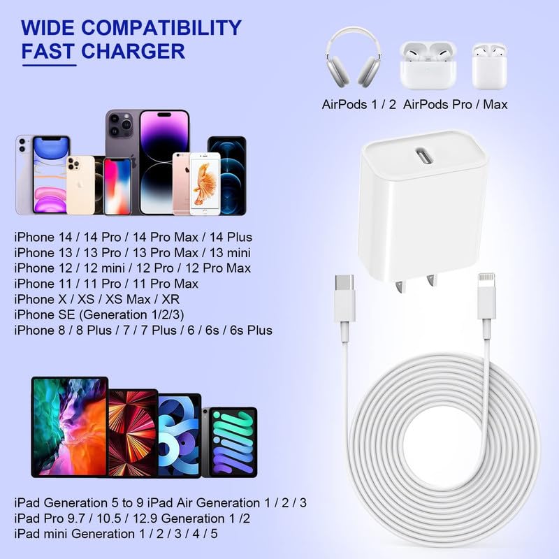 Package List -3Set Fast Iphone Charger Usb Type C Apple Fast Charging -3Set Mfi Certified Lightning Cable Long Iphone Charger Cord 6Foot 20W Usb-C Power Adapter -All Products Has Been 100% Tested Ensure It Works -It Is Made From Tinned Copper And Has High Charging Speed. -Power Supply Is Easy To Fit And Remove. -Ul Certified For Safety, Manufactured With The Highest Quality Materials,Provides Overcharge Protection System/Short Circuit/Overload Protection/Over-Heat Protection. Applicable Apple Equipment -Apple Iphone 14/14 Plus/14 Pro/14 Pro Max -Apple Iphone 13/ 13 Pro/ 13 Pro Max / 13 Mini -Apple Iphone 12/ 12 Pro/ 12 Pro Max / 12 Mini -Apple Iphone 11/ 11 Pro/ 11 Pro Max -Apple Iphone Xs / Xs Max / Xr / X -Apple Iphone 8 / 8 Plus / 7 / 7S Plus -Apple Iphone 6S/6S Plus / 6 Plus/6 -Apple Iphone 5/5S/5C/5 -Apple Iphone Se 2020/Se 2022 -Apple Ipad/Ipod Warranty Policy We Take Full Ownership And Responsibility For The Quality Of Our Chargers. If You Have Any Concerns, Please Contact Us By Email Without Hesitation And We Will Be Glad To Resolve Your Issue Within 24 Hours.