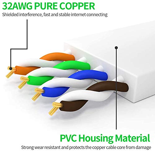 Ultra Slim And Flat Ethernet Cable This Interenet Cable Is Really Thin And Bends So Much Easier Than Round Ones. Its Flat Nature Lets You Run This Wire Perfectly Through The Wall, Along The Floor, Around The Door Frame, Or Under Carpets And Rugs. This 30 Ft Cat 6 Ethernet Cable Is Quite Durable While Also Being Flexible Enough To Wrap Around A Corner. Built For Speed And Reliable Connectivity The Network Cable Is Capable Of Transmitting Data At Speeds Of Up To 1000 Mbps With Increased Transmission Frequencies Of Up To 250 Mhz. It Is Constructed With 4 Twisted Pairs (Utp) Of Copper Wires, With Rj45 Connectors At Both Ends Of The Cable. Compared To The Cat 5E Patch Cable, The More Stringent Specifications And Improved Quality In Twisting Of The Wires Provide Better Protection From Crosstalk, Noise, And Interference. Wide Compatibility Supports Most Devices With Rj45 Jacks, Including Computers, Routers, Switch Boxes, Network Printers, Modems, Smart Tvs, Ps3, Ps4, Xbox One, Xbox 360 And More; Backwards Compatible With Cat5 & Cat5E. Buy With Confidence Any Quality Problem, You Can Get Full Refund And A New Product In First Month. Any Quality Problem, You Can Get Full Refund In Three Months. Specifications: Type: Cat-6 4-Pair Utp Bandwidth: 250Mhz Data Transfer Speed: 1000 Mbps Conductors: 32 Awg Stranded Bare Copper Connectors: Gold-Plated Rj45 (8P8C) Rohs: Confirmed Jacket Material: Pvc Length: 30Ft Width: 0.24In (6Mm) Thickness: 0.07In (1.8Mm) Package Included: -1 X Cat 6 Ethernet Cable 30 Ft White Flat -20 X Free Cable Clips (More Or Less)-2 X Rj-45 Plug Protector Dust Cover Note: Your Network Speed Is Determined By Many Factors, Including The Cable, Your Modem, Router, Other Network Components, And Internet Service Provider (Isp).
