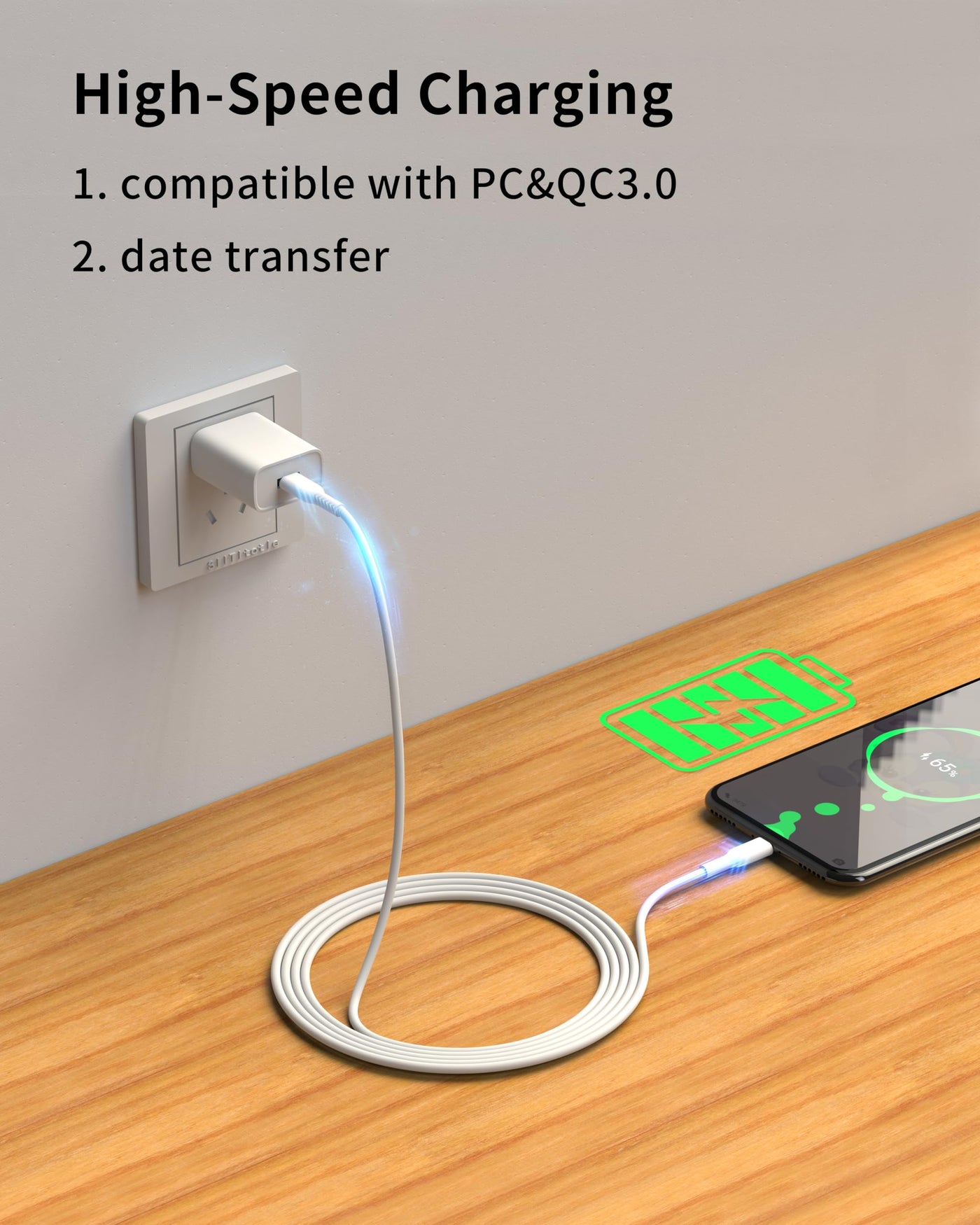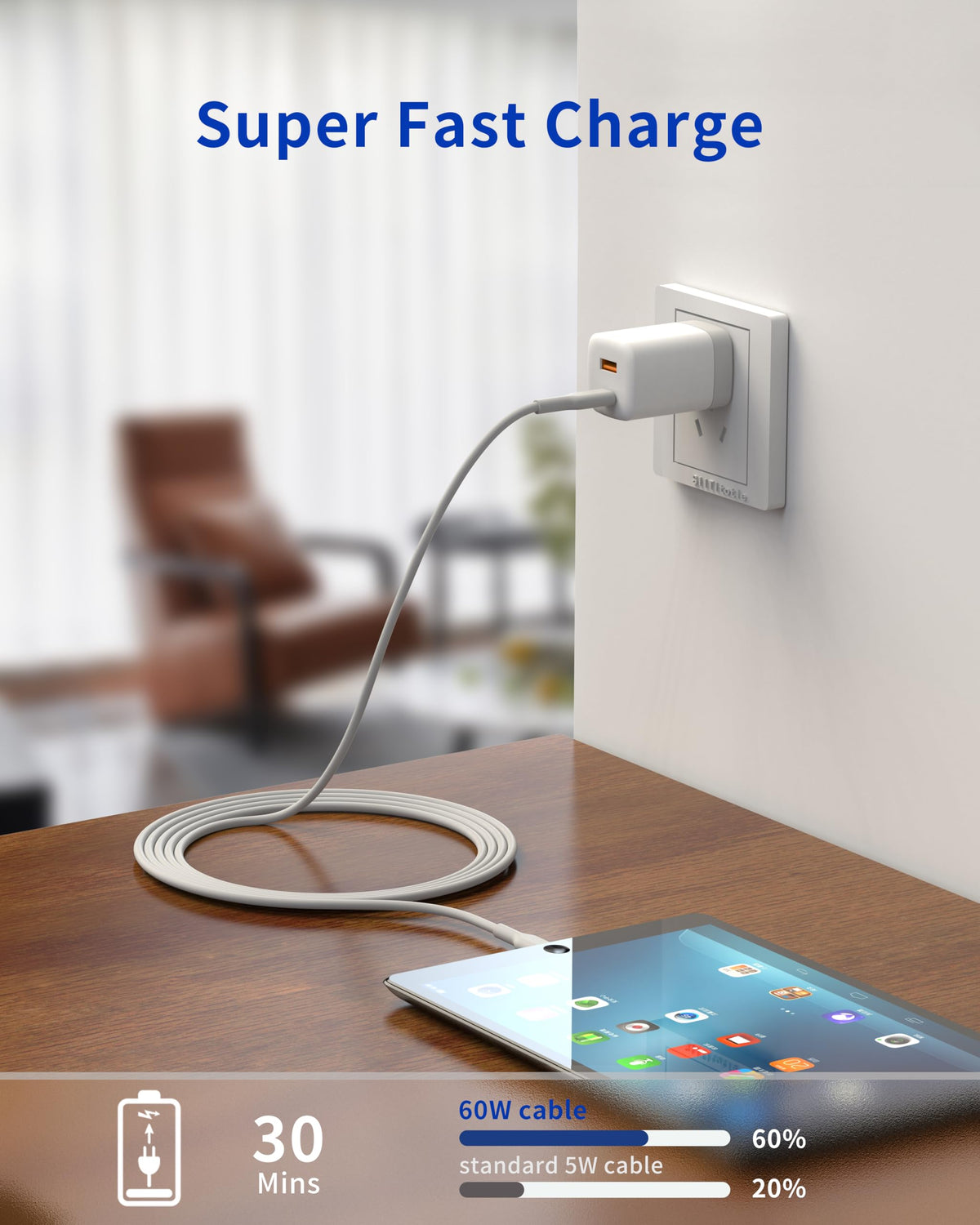 Q: How fast can this USB C to USB C cable charge my devices?A: This cable supports fast charging up to 60W Max (20V/3A) with USB-C Power Delivery adapters. It can charge devices like the iPhone 15 from 0% to 80% in approximately 35 minutes, offering significant time savings compared to standard charging cables.
