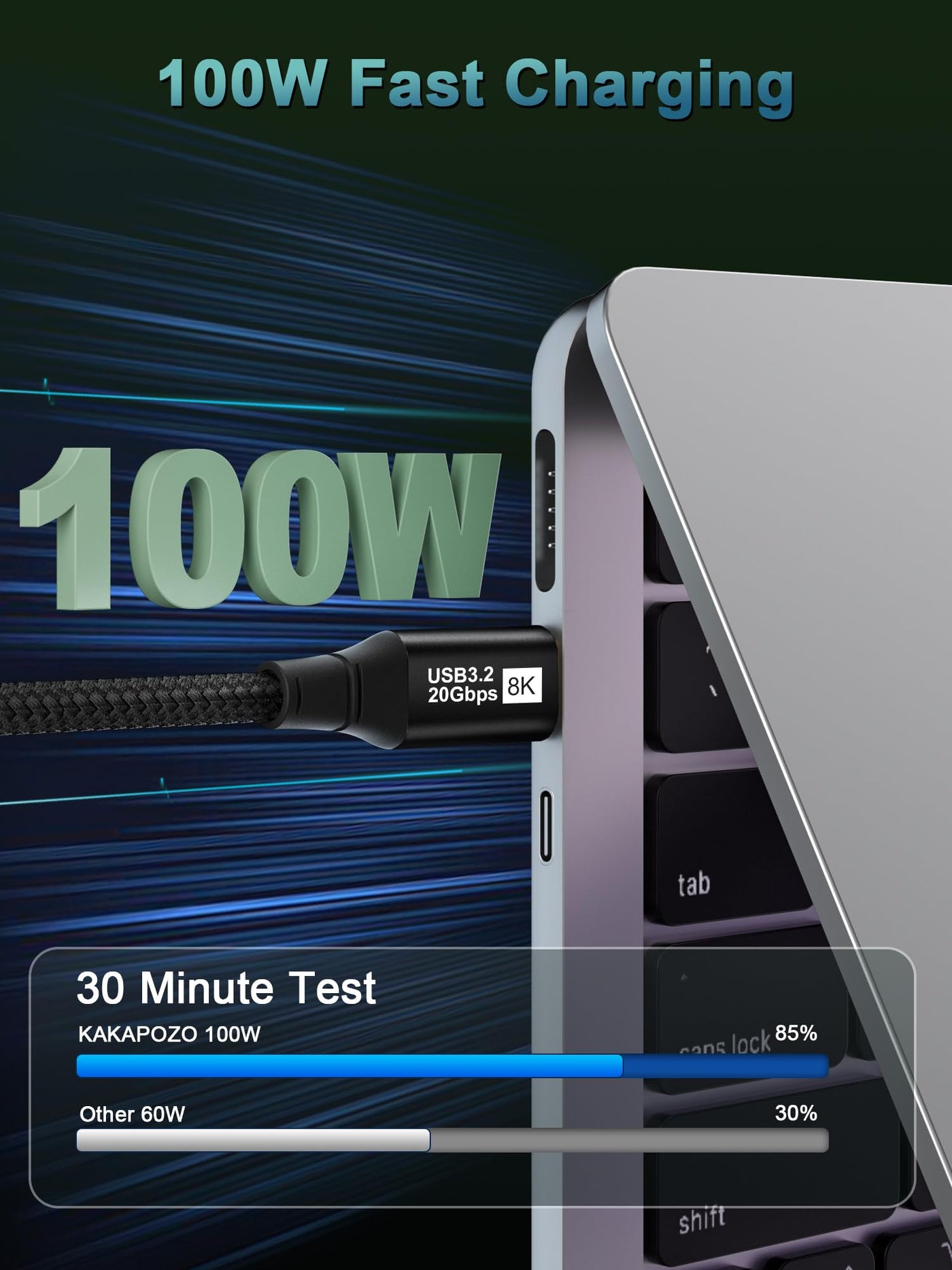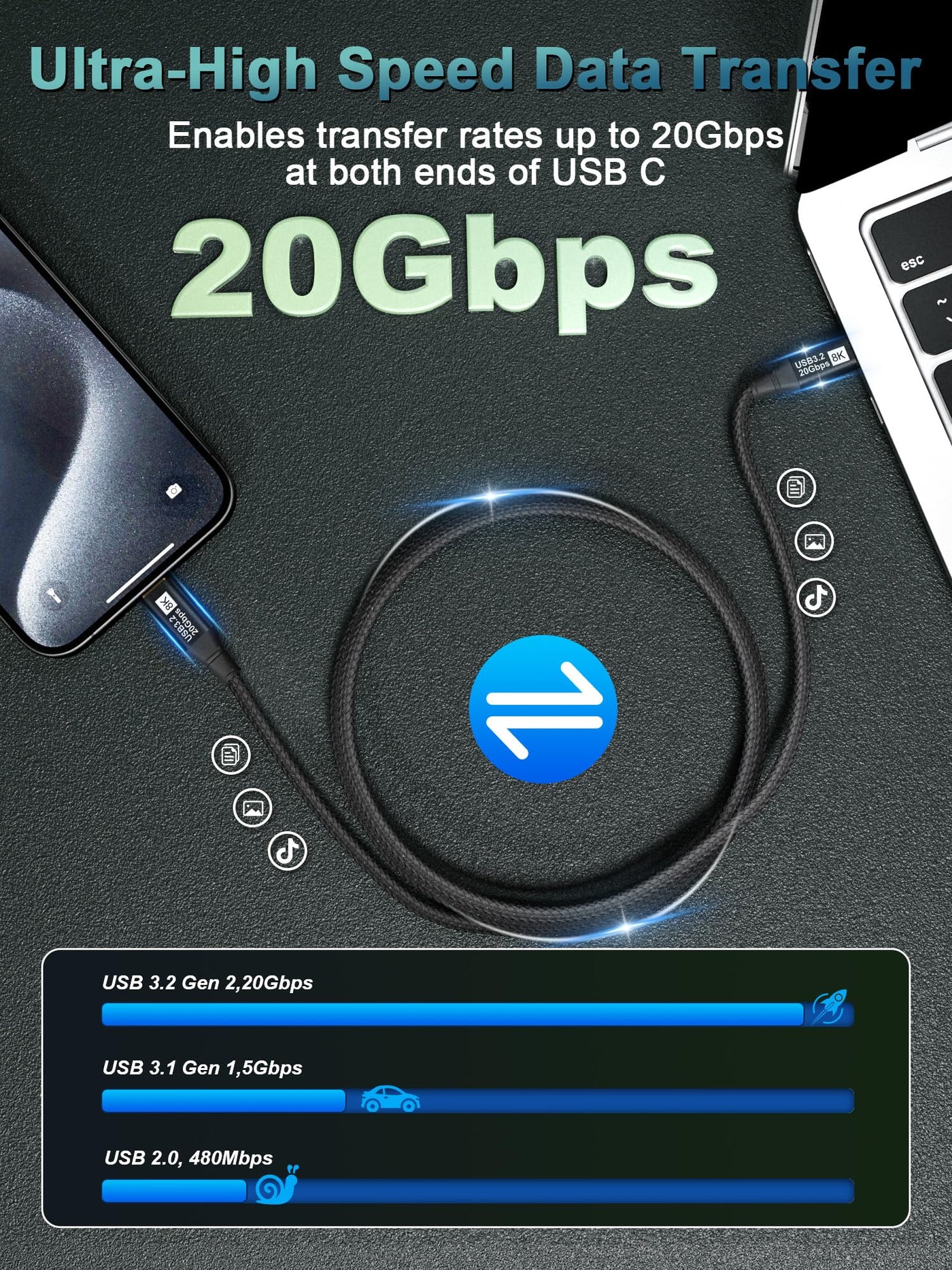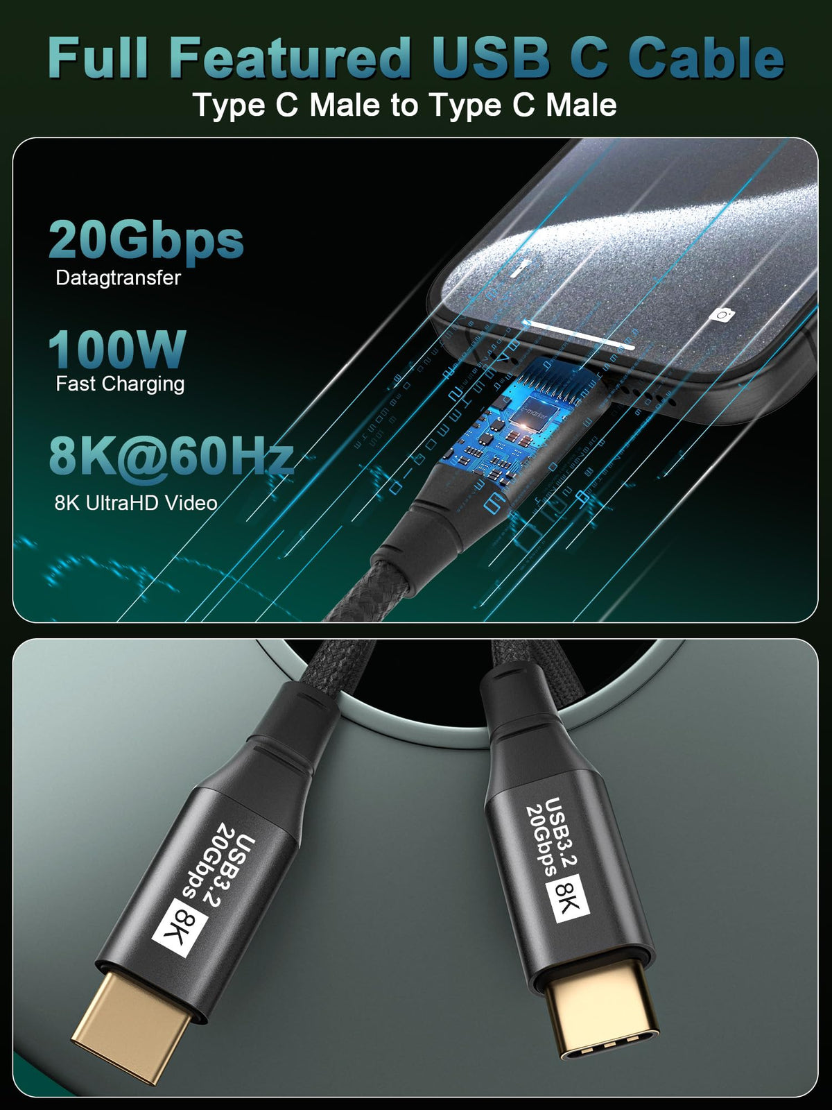 ?Usb C To Usb C 3.2 Gen 2 Cable?Offers 20Gbps Superspeed Data Transfer And Up To 100W Pd/Qc Fast Charging Simultaneously. Supports Displayport Alternate Mode (Dp Alt Mode), Audio And 8K@60Hz Video Signal For Video Output And Connecting Usb-C Monitor. ?100W Fast Charging?Iphone 15 Charger Cable Supports Max 5A Current 100W Power Through. Fully Meet The Charging Power Needs Of Professionals For Iphone 15 Pro/Max/Plus, Macbooks Pro, Android Devices, Samsung, And Ipad Pro Charging Any Usb-C Device At Max Speed. Note: Requires A C-Port Adapter Of Appropriate Power. ?8K@60Hz Usb C Monitor Cable?Supports Usb C To Usb C Monitor Dp Alt Mode Features, Including 8K@60Hz((7680 X 4320) Uhd Resolution) And Dual 4K@60Hz(Downward Compatible 4K@120Hz, 4K@144Hz) Ultra High Resolution And High Refresh Rate Video. Connect A Usb-C Device To A Usb-C Monitor Or Docking Station To Transfer Power And Video From Your Computer For The Usbc Monitor. Plug And Play, No Program To Install. ?Completely Durable?Braided Nylon Usb C Usb C Cable Has Passed The 30,000+ Bending Test, Strong And Also Flexible. Premium Aluminum Housing With High Interference Resistance, For Better Cooling And Durability. Highly Conductive 32Awg Wire, Flexible And Durable. Currently There Are 3 Sizes Available, 3.3Ft/1M, 6.6Ft/2M, 3.3Ft/1M, 3.3Ft/1M, 3.3Ft/1M And 3.3Ft/1M. 6.6Ft/2M, And 10Ft/3M