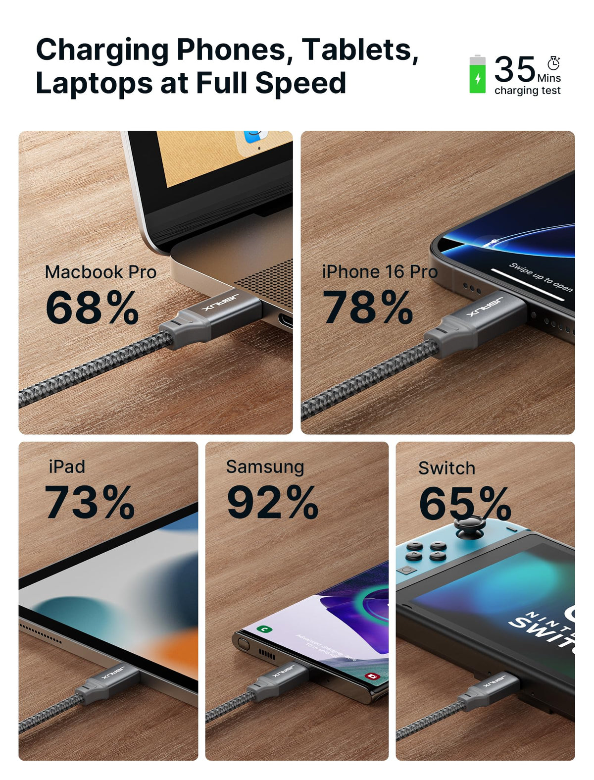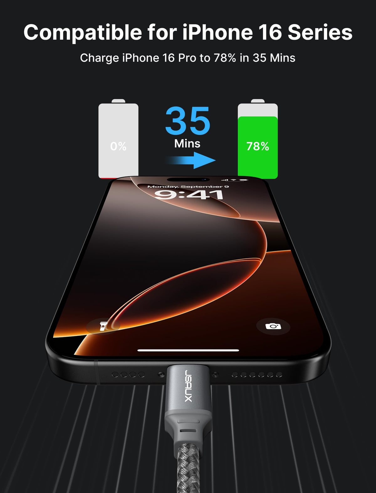 Q: What devices are compatible with the JSAUX 100W USB C to USB C Cable?A: The JSAUX 100W USB C to USB C Cable is compatible with a wide range of USB C devices, including the latest iPhones (iPhone 16 series, iPhone 15 series), Samsung Galaxy S series (S25, S24, S23, S22), MacBook Air/Pro, Google Pixel devices, and many other tablets and laptops equipped with USB C ports.