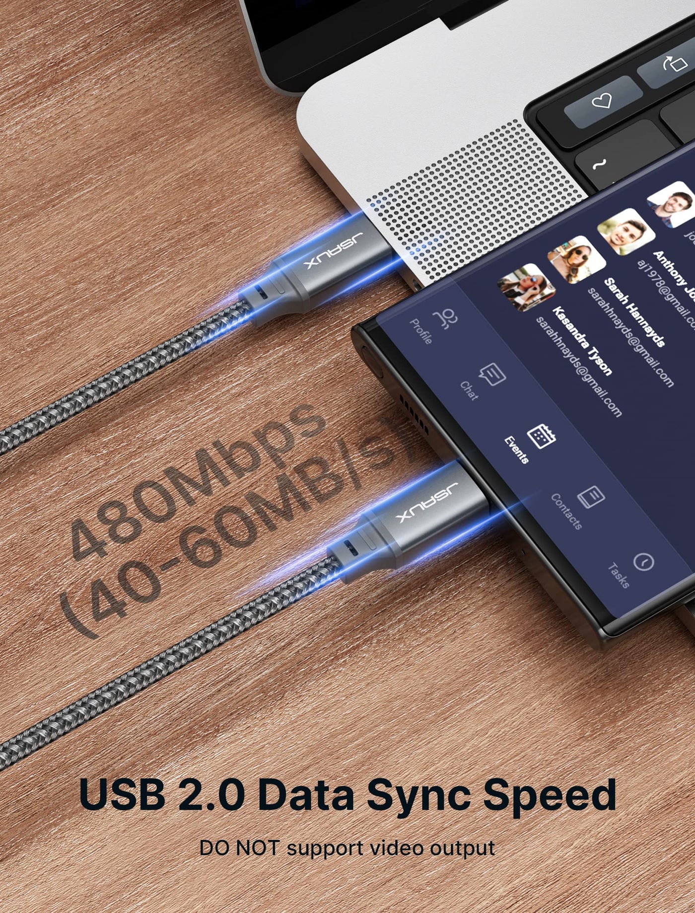 [Double Ended Usb-C Cable] This Is The Usb-C To Usb-C Cable. Not The Usb-C To Usb-A Cable, Which Means It Has The Same Usb-C Charger Block On The Both Ends, So You Need A Usb-C Wall Charger To Charge Your Device. Note: This Product Do Not Support Video Output. | [100W Usb C Fast Charging] Jsaux 100W Usb C Charger Cable Has Pd 2.0 And Qc Fast Charging Technology, Supports Up To 100W (20V/5A) Output With Usb-C Power Delivery Adapters Such As 20W/30W/45W/60W/65W/96W/100W. Transfer Speed Can Reach 40~60Mb/S (480Mbps). (Note: The Actual Charging Speed Depends On Your Device And Wall Charger.) | [Build In Emark Chip] This Usbc To Usbc Cable Has A Built-In Super E-Mark Chip, Which Will Intelligently Identify The Charging Device And Its Charging Power, Thus Adjusting The Appropriate Voltage And Current To Provide The Fastest Fast Charging Power Without Overloading And Protecting Your Device'S Battery. It Also Detects When The Battery Power Reaches 80% And Turns On The Trickle Mode To Effectively Extend The Life Of The Battery And The Device. | [Certified Safety & Quality Assurance] Jsaux Type C To Type C Cable Has Electronic Safety Certifications That Comply With Appropriate Standards, You Have No Need To Worry About This Cable Quality At All. Upgraded 3D Aluminum Connector And Exclusive Laser Welding Technology, Which Can Ensure The Metal Part Won'T Break. | [Perfect Compatibility] Jsaux Usb C To C Cable Compatible With Virtually All Usb-C Devices Including Phones, Tablets, And Laptops. Such As Macbook Air/Pro, Iphone 16/16 Plus/16 Pro/16 Pro Max, , Iphone 15/15 Plus/15 Pro/15 Pro Max, Samsung Galaxy S24/S23/S22/S21/S20/Note 20 Series, Pixel Series, Ipad Mini 6, Ipad Pro, Ipad Air, Steam Deck, Switch And More Upcoming Devices With Usb-C Port. | [What You Get] We Provide This Usb C To Usb C Fast Charging Cable 2 Pack With An 18-Month Worry-Free Period And 24/7 Friendly Client Consultation, If You Have Any Questions, We Will Resolve Your Issue Within 24 Hours