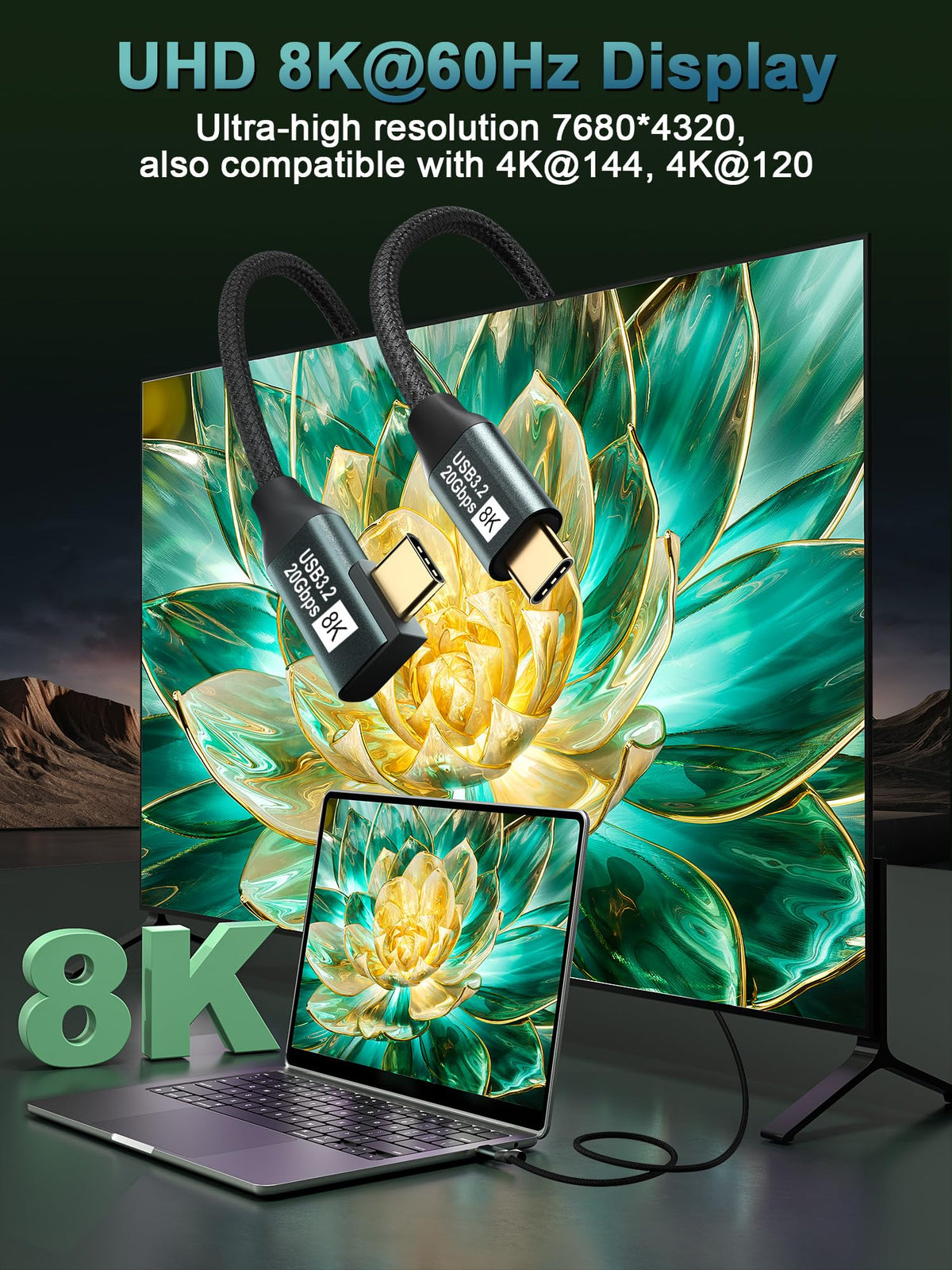 ?8K@60Hz Video Transmission [Input & Output]?:This Usbc To Usbc Video Cable Supports Displayport Alternate Mode (Dp Alt Mode), Audio And 8K@60Hz Video Signal For Video Output And Connecting Usb-C Monitor, Power Delivery And Video From Your Computer For A Usbc Monitor Such As The Mb169C Type-C Portable Monitor, Zenscreen Mb16Ac Or Aoc I1601Fwux Usb-C Powered Portable Monitor Or Lg 4K 8K Monitor With This Usb-C Monitor Cable. ?Pd100W High Speed Fast Charging?:100W Usbc To Usbc Data Transfer Cable Provides Power Delivery For Charging Your Laptop, Tablet Or Phone Up With Up To 100 Watts; Use A Single Usb C Power Delivery Cable To Charging Your Computer Or Phone; Utilizes E-Marker Chip To Safely Deliver Up To 100W (5A) Of Power, Charges Any Usb-C Device At Max Speed. ?20Gbps Fast Data Transfer?:This Usb C Display Cable, Tap Into Data Transfer Speeds Of Up To 20Gbps, Giving You Access To Faster Download Times, Improved Video Resolutions, Quick Data Transfers, And More. Usb3.1 Gen 2 2 Marks A Huge Increase In Power, Data, And Video Signals Compared To Previous Interfaces, More Than 4X That Of Usb 3.0 (Usb 3.2 Gen 1). Connect Hard Drive And Ssd To Transfer Big Files In Seconds, Giving You Access To Faster Download Times, Improved Video Resolutions, Quick Data Transfers, And More. ?Advanced Right Angle Design?: Compared To Conventional Charging Cables, This Usb C To Usb C Monitor Cable Features An Ergonomic 90 Right Angle ''L'' Design That May Successfully Prevent Typical Wear, Straining Cable And Connection Issues And Increase The Life Of The Charging Cable. Its Ergonomic Design Makes It Easier And More Comfortable To Play Games, Use Apps In Portrait Mode, Watch Videos, And Read E-Books While Charging. Besides, It Can Be Used In Any Cramped Corner.
