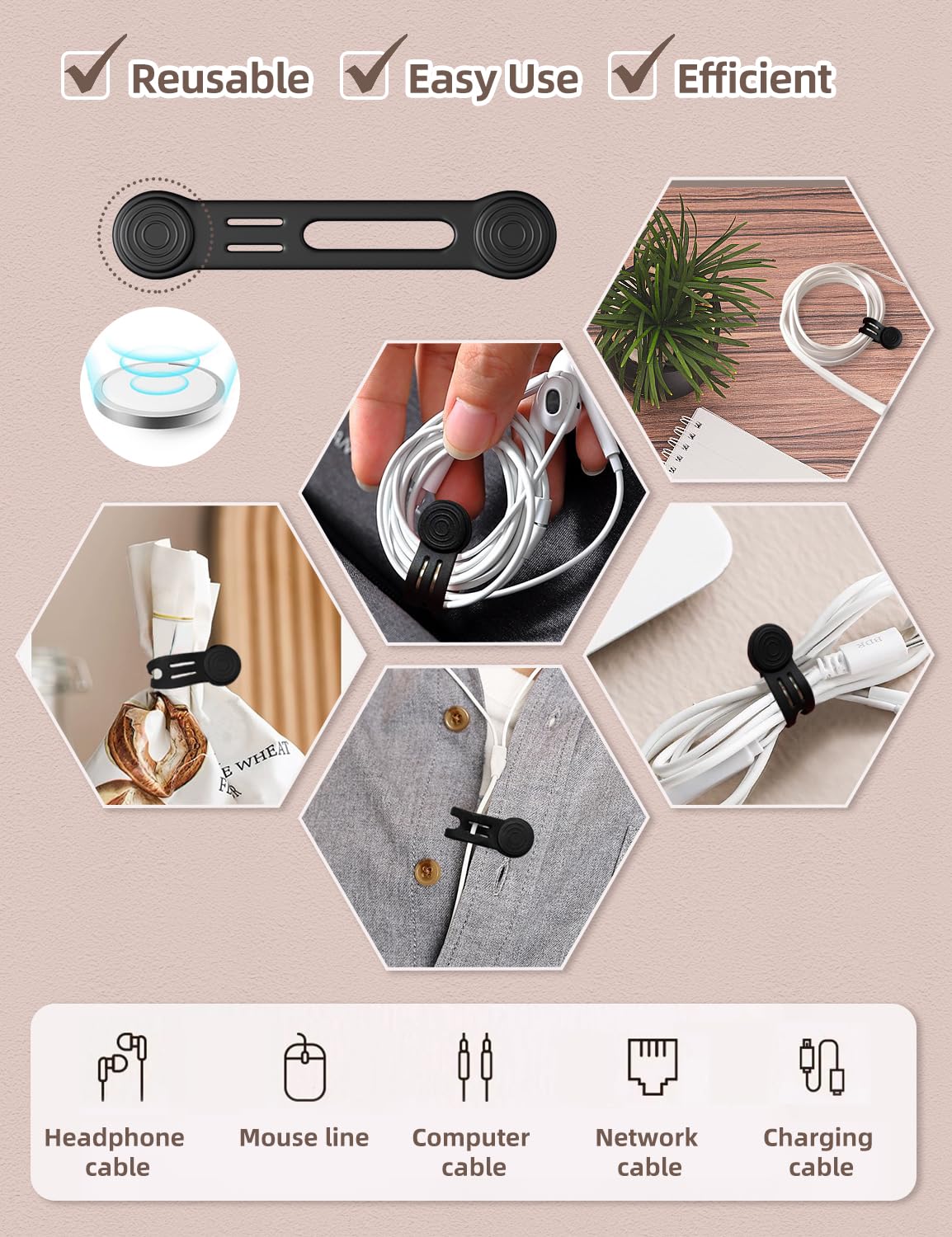 Q: Can I use these magnetic ties for different types of cables?A: Yes, the Kanemc Magnetic Ties are designed to accommodate various thin cables such as smartphone chargers, earphones, and USB cables. Their hollowed-out design allows for easy adjustment and prevents cable loss.