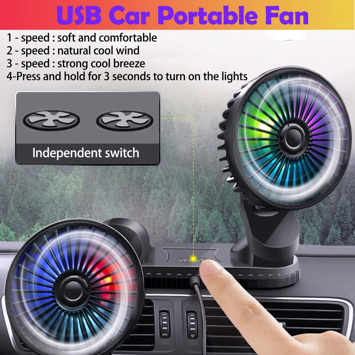 Kinowji Car Cooling Fan,360 Adjustable Dual Head Cooling Air Fan Usb Fan Vehicle Fan With Coloured Light Brushless Motor For Car