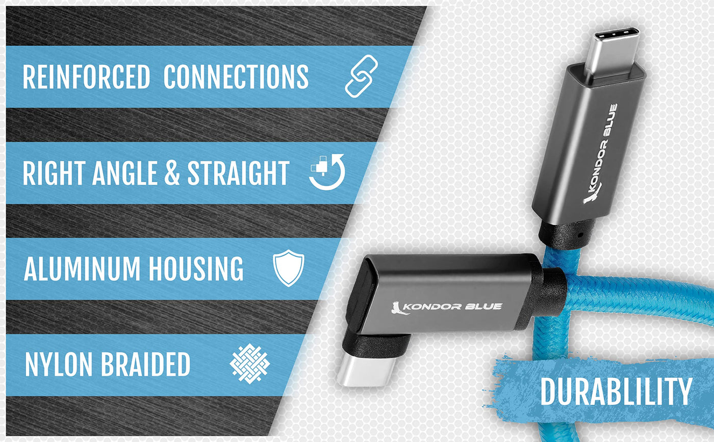 Kondor Blue 12'' Straight Usb C 3.1 Gen 2 10 Gb/S 100W | Right Angle Braided Cable For 8K Data And Power Delivery