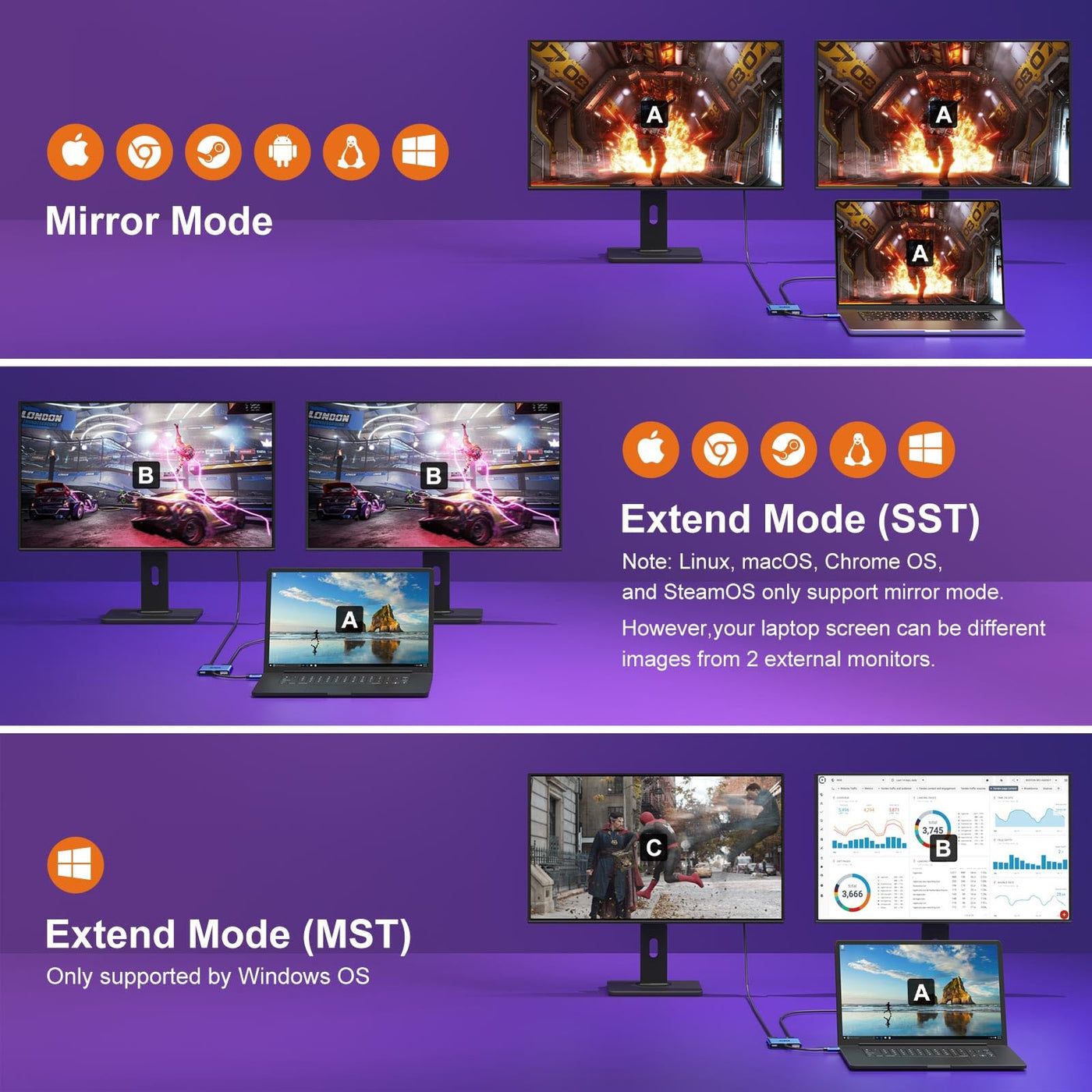 ?Usb 3.0 To Dual Hdmi Adapter ?This Kozyc Usb-C Adapter Features 2X Hdmi Port, 1X Usb 3.0 Port, And 1X100W Pd Charging Port, Note: Android System Only Supports Aaa Mode(Mirror Mode); Macos Supports Aaa, And Abb Mode (Does Not Support Mst Abc Mode); Windows Os Supports Aaa, Abb, Aba, And Abc Mode. | ?4K Resolution?This Usb C To Hdmi Adapter Resolution Is Up To 4K@30Hz. With Backward Compatible With 60Hz For Resolutions Of 2K/1080P. Please Note: If You Want To Get A 4K Resolution, Please Make Sure Your Device Supports 4K And Uses A Hdmi Cable 2.0 Or Better | ?Plug And Play?No External Power Supply Is Required For This Usb C To Hdmi Adapter, Just Plug And Play, And No Need For Any Driver. Note: Not For All Usb-C Port Laptops, Make Sure Your Laptop Or Pc Supports