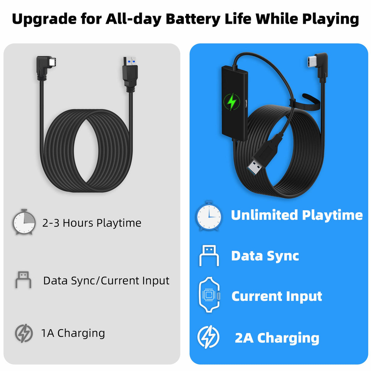Compatible With Quest 3/Quest 2 Accessories: Kuject Link Cable Can Be Used With A Original Charging Cable And Charger To Give Vr Headset The Effect Of Charging And Playing At The Same Time, Allowing You To Play Vr Games All Day Without An Additional Battery Pack | All Day Playtime: Kuject New Release Mt005 Link Cable With Separate Charging Port Is Able To Provide Stronger Output While Playing To Provide You All Day Playtime. While Other Traditional Link Cables Including The Official Verse Only Support Limited Output When Connected To The Computer Usb Port To Play Games, Thus The Battery Drains When Connected To Pc To Play Games | Safe Charging: Exclusive Smart Chips Are Adopted To Intelligently Control The Current Input Within A Reasonable Range To Ensure The Safe Use Of Electricity And Battery Life. The Smart Chip Balances The Current And Makes The Battery Always At 75% When You Play Pcvr Games | No Latency And Delay: Usb 3.0 Port And Charging Port Are Separately Working For Data Transmission And Current Input. Thus The Performance For The Games Will Not Be Affected When You Charge, Which Transfer Rate Can Reach 5Gbps | Kindly Reminder: For The Sake Of Safety, Kuject Mt005 Link Cable Is Designed Not To Support Fast Charging While Playing But Could Guarantee Enough Power While Playing In 90Hz Mode. It Is Great Accessories For Quest 3 And Quest 2
