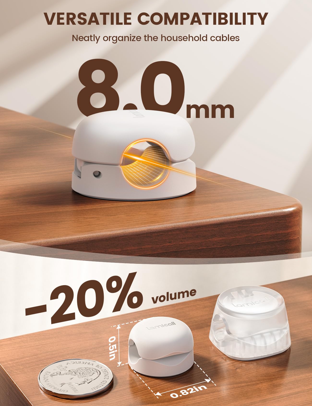 Q: What is the size and weight of the Lamicall Cord Organizer?A: The Lamicall Cord Organizer measures 0.82 inches in length and width, and 0.50 inches in height. Each clip weighs only 3 grams, making them compact and lightweight, perfect for discreet use in tight spaces.
