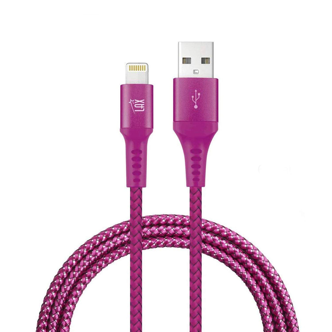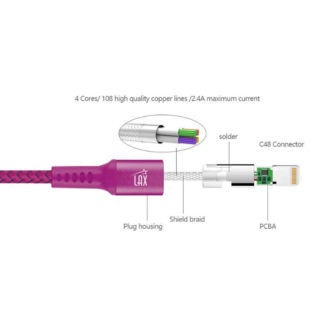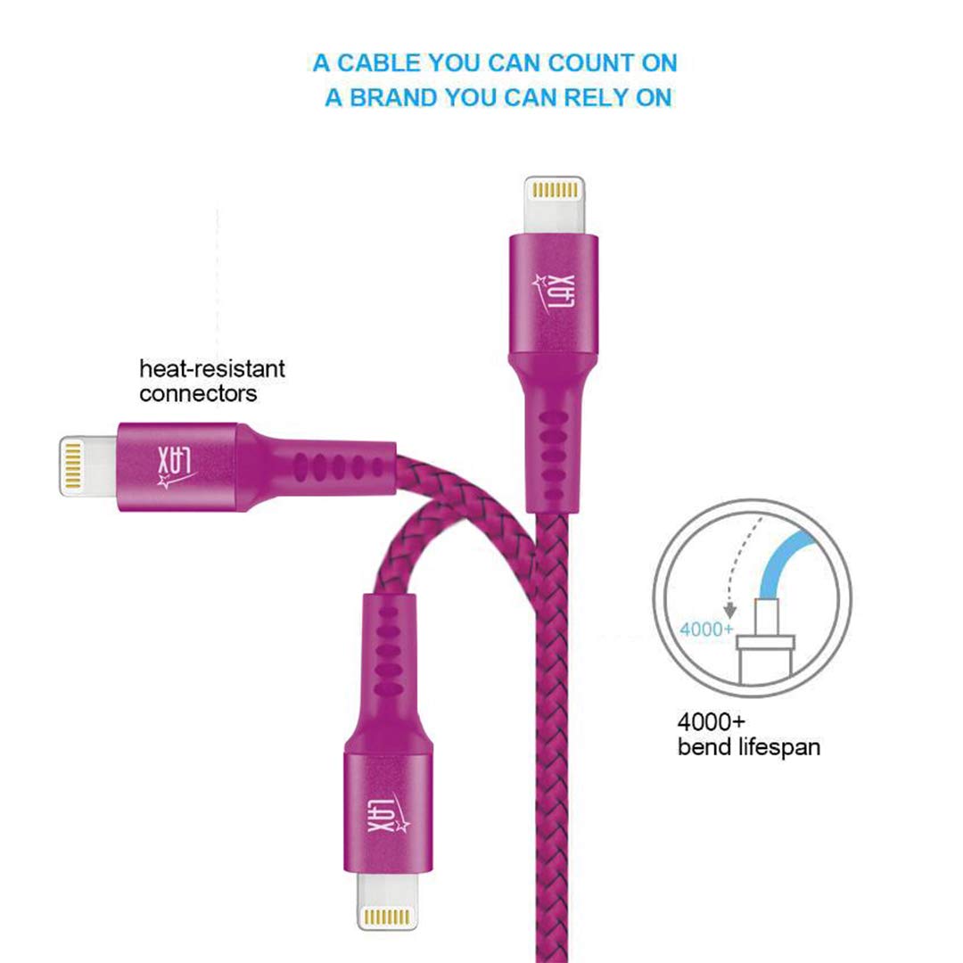 Q: What makes the LAX Lightning Cable durable and long-lasting?A: The LAX Lightning Cable features a nylon braided design that enhances its durability, along with reinforced connectors that prevent breaking at the points of use, making it suitable for heavy daily use.