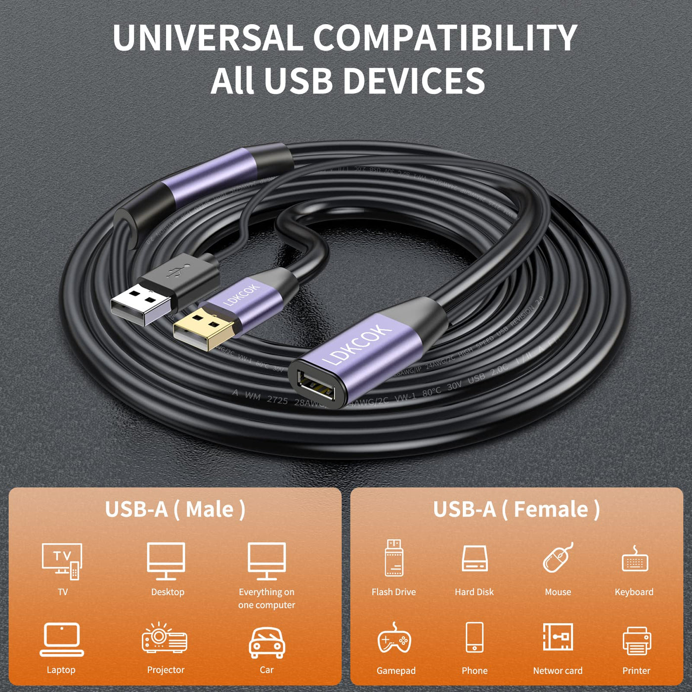 Ldkcok Usb Cable 2.0 Active Repeater Extension Cable ? The Standard Usb 2.0 Cable Provides The High-Speed Data Transmission Rate Up To 480Mbps. ? Usb 2.0 Extension Cable With Full Cover Design Of Female Header, Reinforced Sr Design, Flexible Pvc Jacket, Pass 10,000 Times Bending Test, To Increase Its Service Life To Be More Longer. ? All The Conductive Wire Cores Are Made Of High-Quality Oxygen-Free Copper. Cable Constructed With Aluminum Foil Shielding Layers, Which Has Stronger Anti-Interference Ability, Ensure Signal Transmission More Stable. Product Features ? Wire Twisting: Unique Signal Wire Pair Twisting Method Is Adopted To Increase Signal Transmission Stability ? Od: The Cable Outer Diameter Is 5.00.2 Mm ? Wire Material: Ofc (Oxygen Free Copper) ? Jacket Material: Flexible Pvc Jacket ? Connectors Material: Brass ? Surface Treatment Of Connectors: Gold Plated ? Application: Suitable For Usb A Devices, Such As Pc, Laptop, Macbook, Matebook, Tv, Playstation, Xbox, Usb Hub, Printer, Scanner, Camera, Flash Drive, Card Reader, Bluetooth Adapter, Hard Drives Ssd Or Hdd, Mouse, Keyboard, Ps Controller Etc. Installation ? Free Drive -No Drivers Required On Any Os, Including Windows, Mac Os, Linux, Chrome Os, Etc. ? Please Hold The Connectors By Hand To Plug And Unplug, Avoid Drawing The Wire Itself Directly. Warranty ? 12 Months Warranty For Quality-Related Issues, Lifetime Technical Support & Friendly Customer Service.