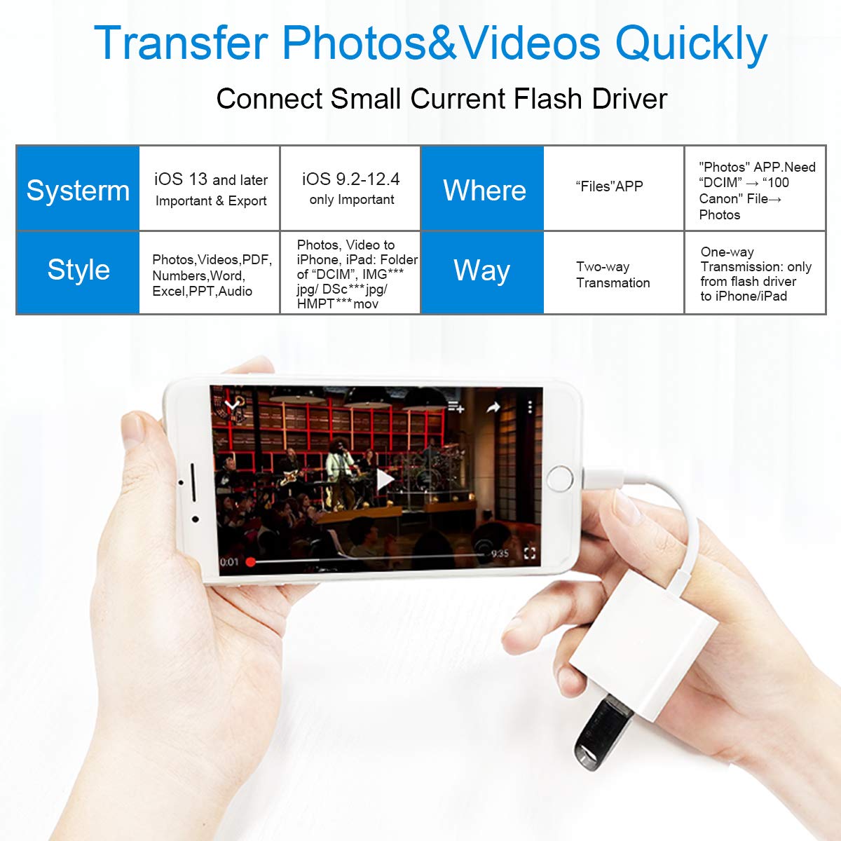 Q: What devices are compatible with the Lightning to USB3 Camera Adapter?A: The Lightning to USB3 Camera Adapter is compatible with multiple devices including iPhone models such as iPhone 11, Xs, Xs Max, X, 8, 8 Plus, 7, 7 Plus, 6, 6 Plus, 5, 5S, SE, and iPad models like iPad Air, Mini, and Pro. It supports iOS versions from 9.2 to 13 and earlier.