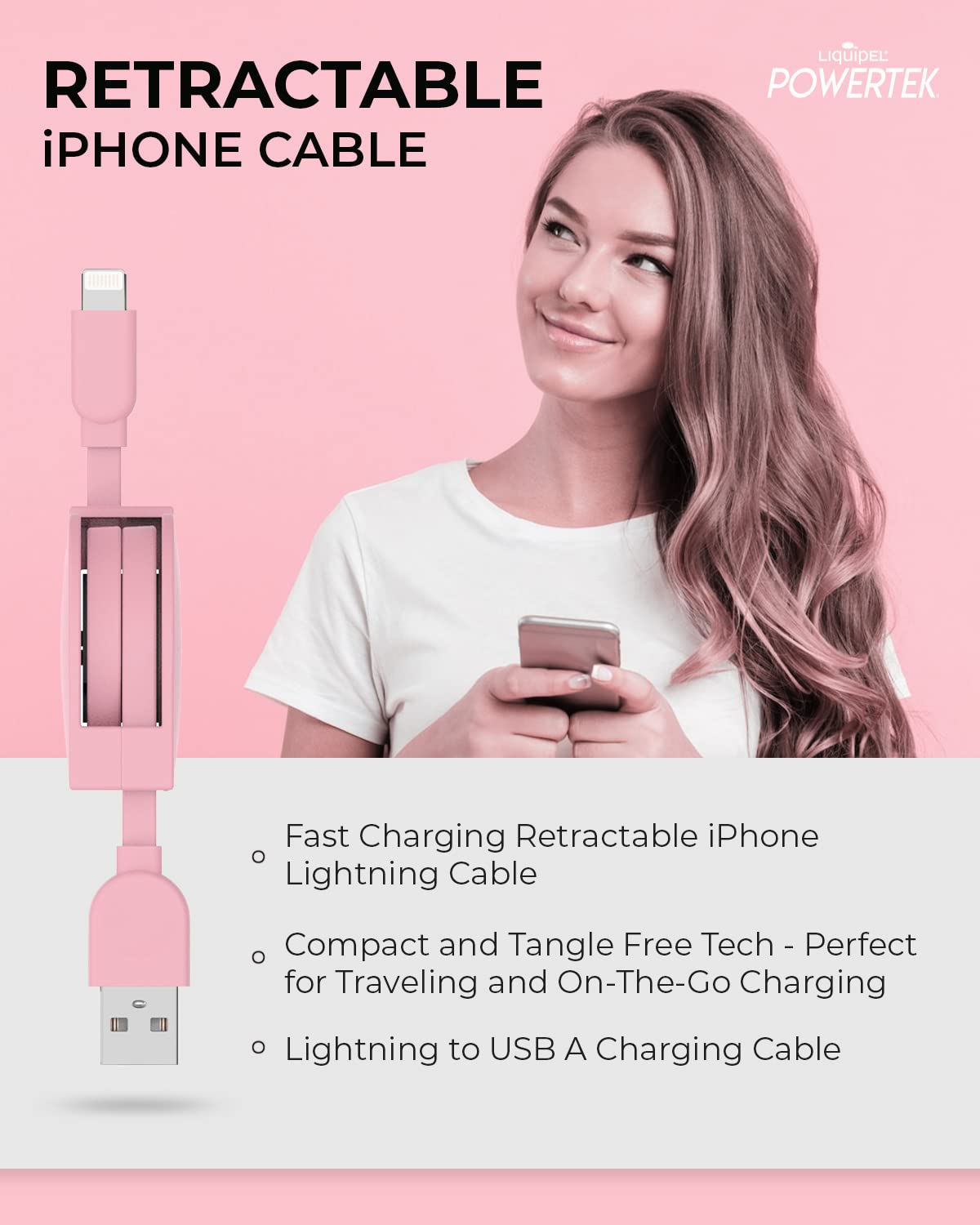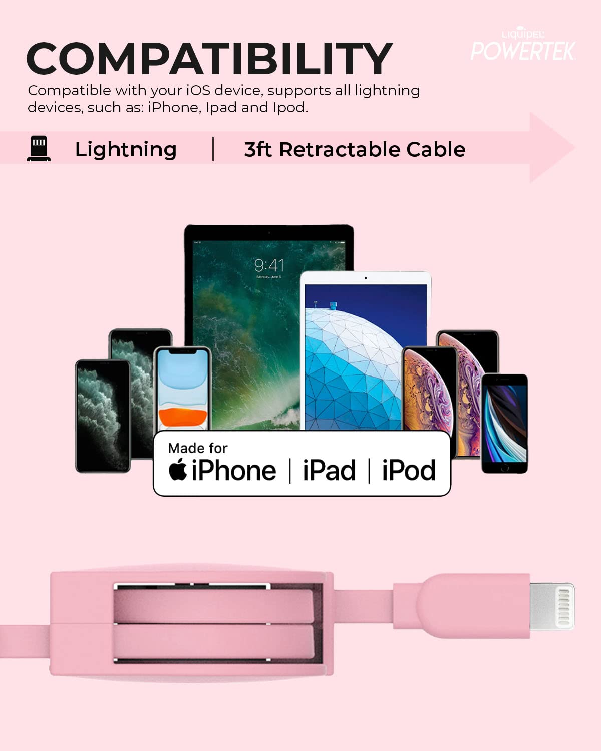 Liquipel Powertek Retractable Mfi Certified Charger Compatible For Apple Iphone, Ipad, 3Ft Cable, Lightning To Usb Cable Cord, Fast Charging Lightning Cable (Pink)