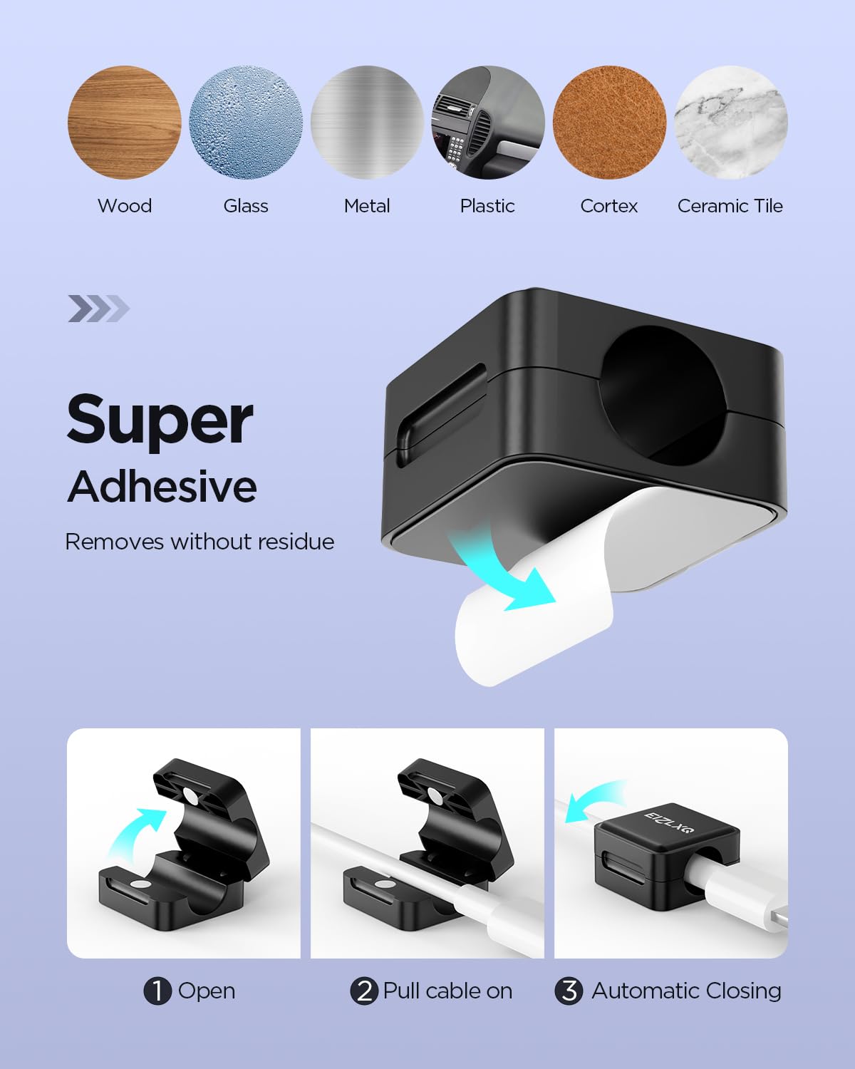 Q: How does the adhesive work on the cable clips?A: The EIZLXQ cable organizer comes with a no-residue adhesive that securely bonds to clean surfaces without causing damage. It is designed for easy removal and relocation, with spare stickers provided for added convenience.