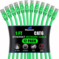 Maximm Cat 6 Ethernet Cable 1 Ft (12 Pack) High Speed Lan Cable, Internet Cable, Patch Cable, And Network Cable Utp, 10Gbps, 550Mhz Ethernet Cord Green
