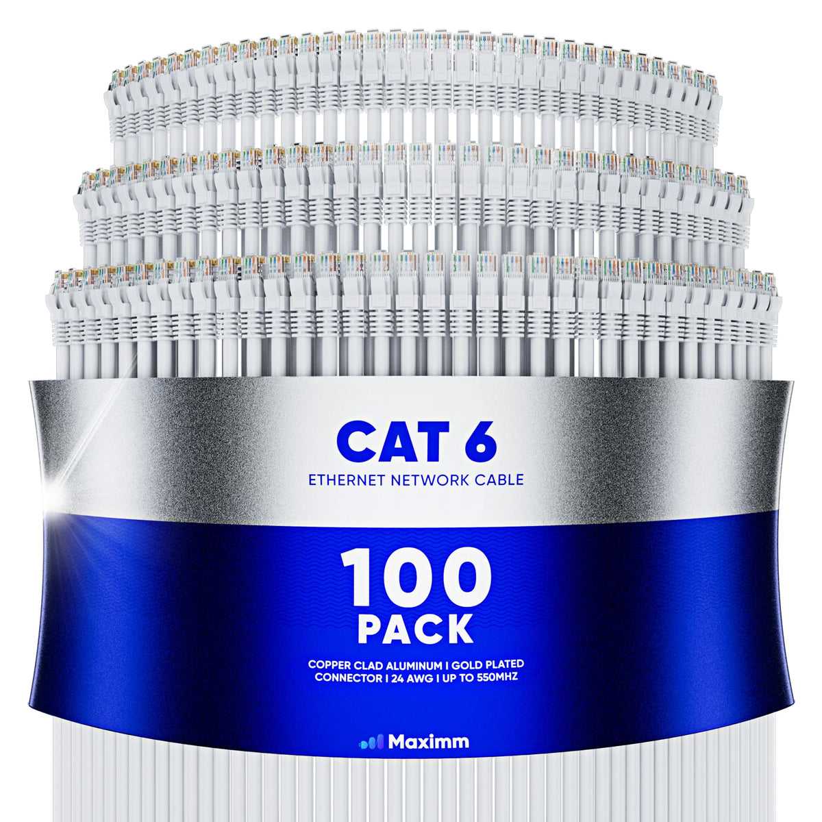 Maximm Cat 6 Ethernet Cable 2 Ft (100 Pack) High Speed Lan Cable, Internet Cable, Patch Cable, And Network Cable Utp, 10Gbps, 550Mhz Ethernet Cord White
