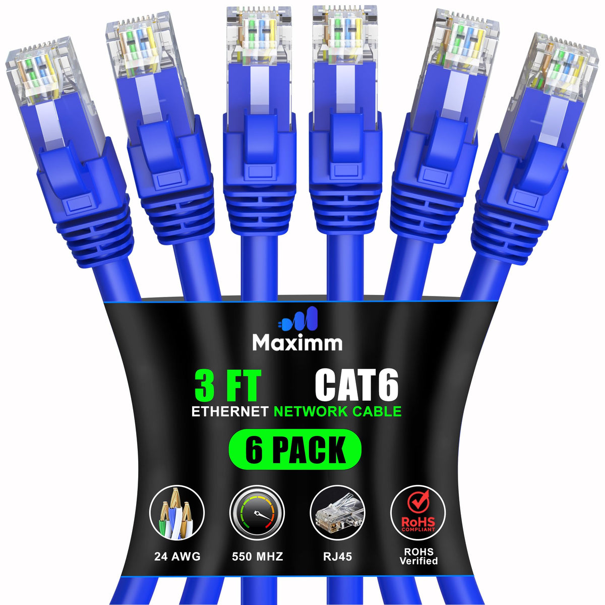 Q: What is the length and color of the Maximm Cat 6 Ethernet Cable included in the pack?A: This product includes six 3-foot long Maximm Cat 6 Ethernet Cables in a vibrant blue color, making them suitable for various setups and environments.