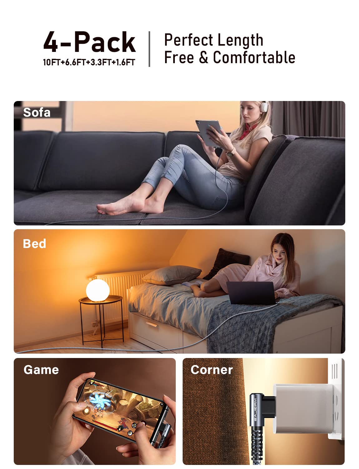 Mrglas Usb C Cable 3.2A?Upgraded 90& Gold Plated?, [4 Pack,10+6.6+3.3+1.6Ft] Type C Fast Charging Cable Right Angle Durable Nylo
