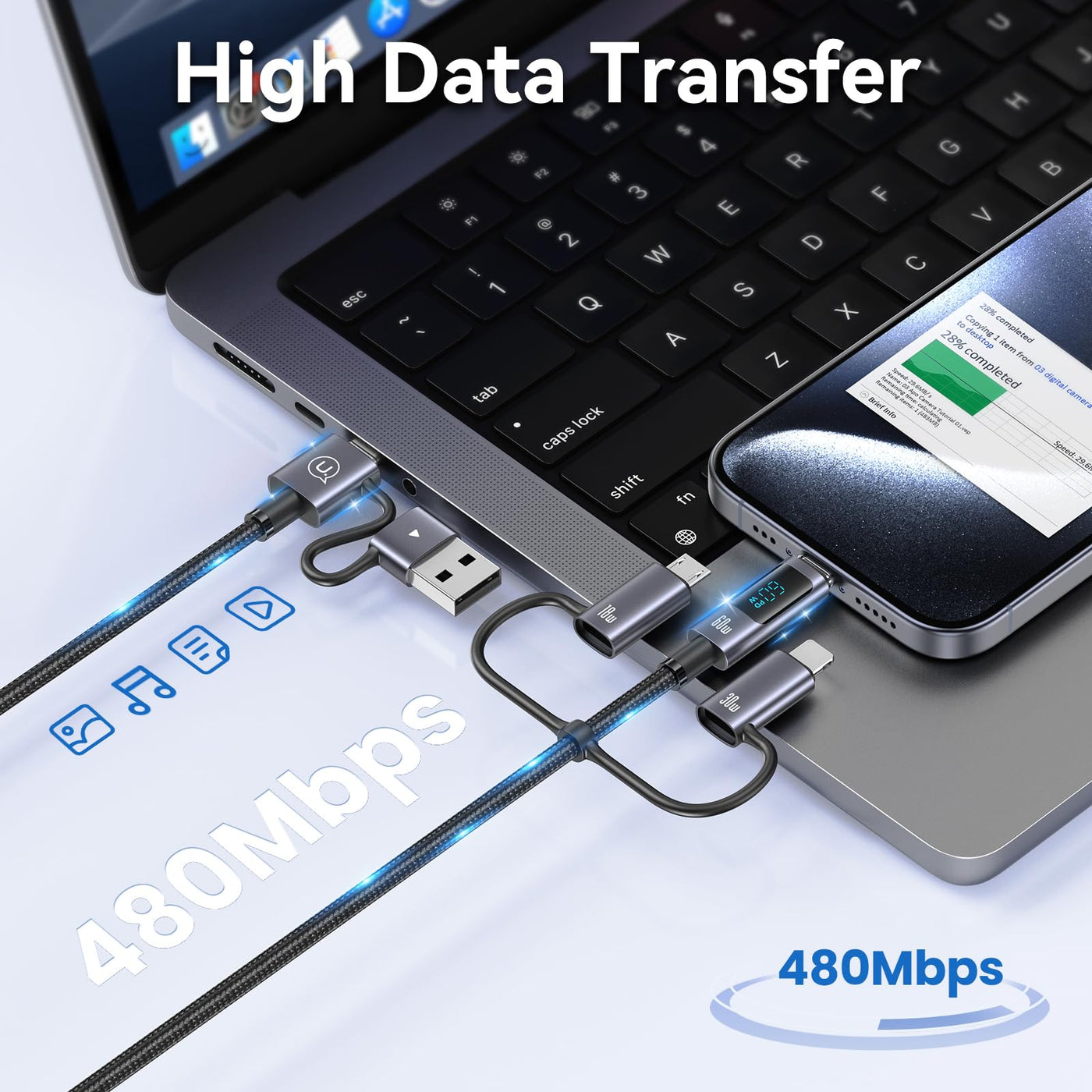 Q: How fast does this charging cable transfer data?A: This USB C multi charging cable offers data transfer speeds of up to 480Mbps, allowing you to transfer a 1GB file in just 30 seconds, making it efficient for both charging and data synchronization.
