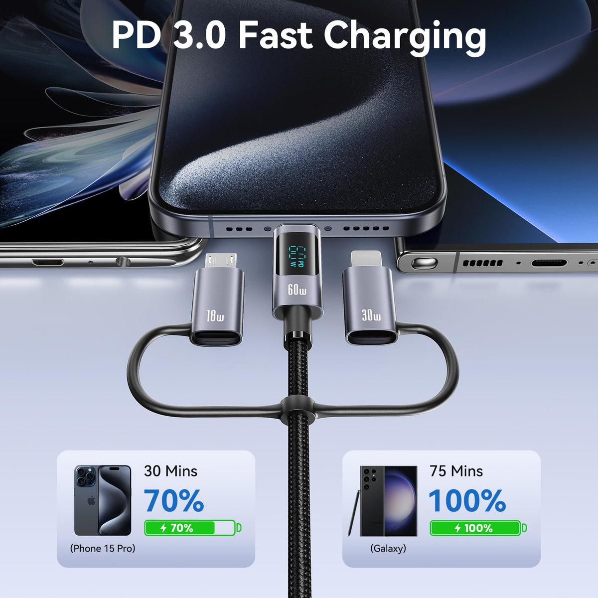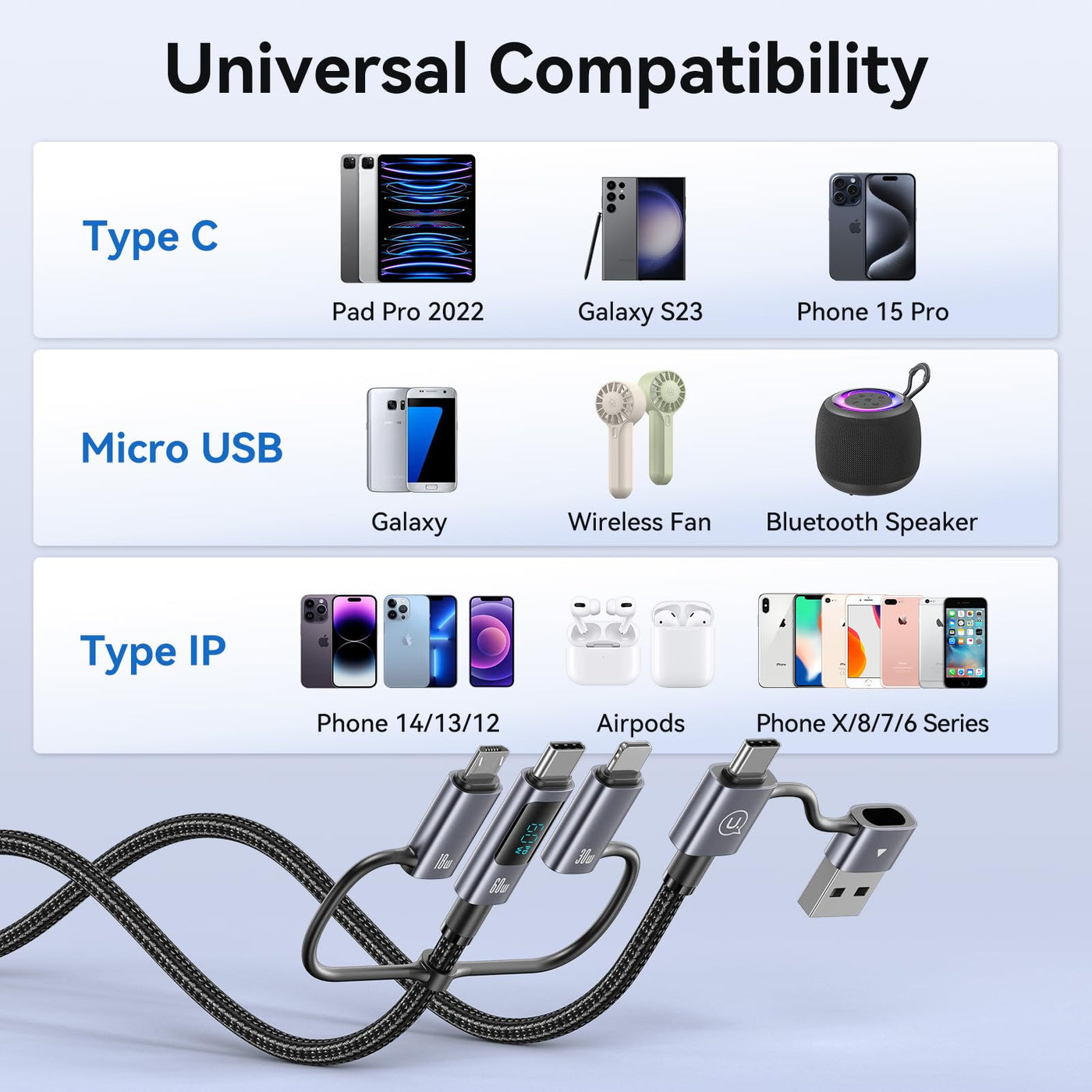 Multi Charger Cord 6 In 1 Usb Cable Fast Charging Cable Pd 60W Usb C Multi Fast Charging Cable With Led Display 4 Ft Usb C/A