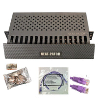 Q: What is included in the Neat Patch 2U Cable Management Kit?A: The Neat Patch 2U Cable Management Kit includes one 2U Neat Patch unit along with 48 CAT6 patch cables, each measuring 2FT in length and colored purple.
