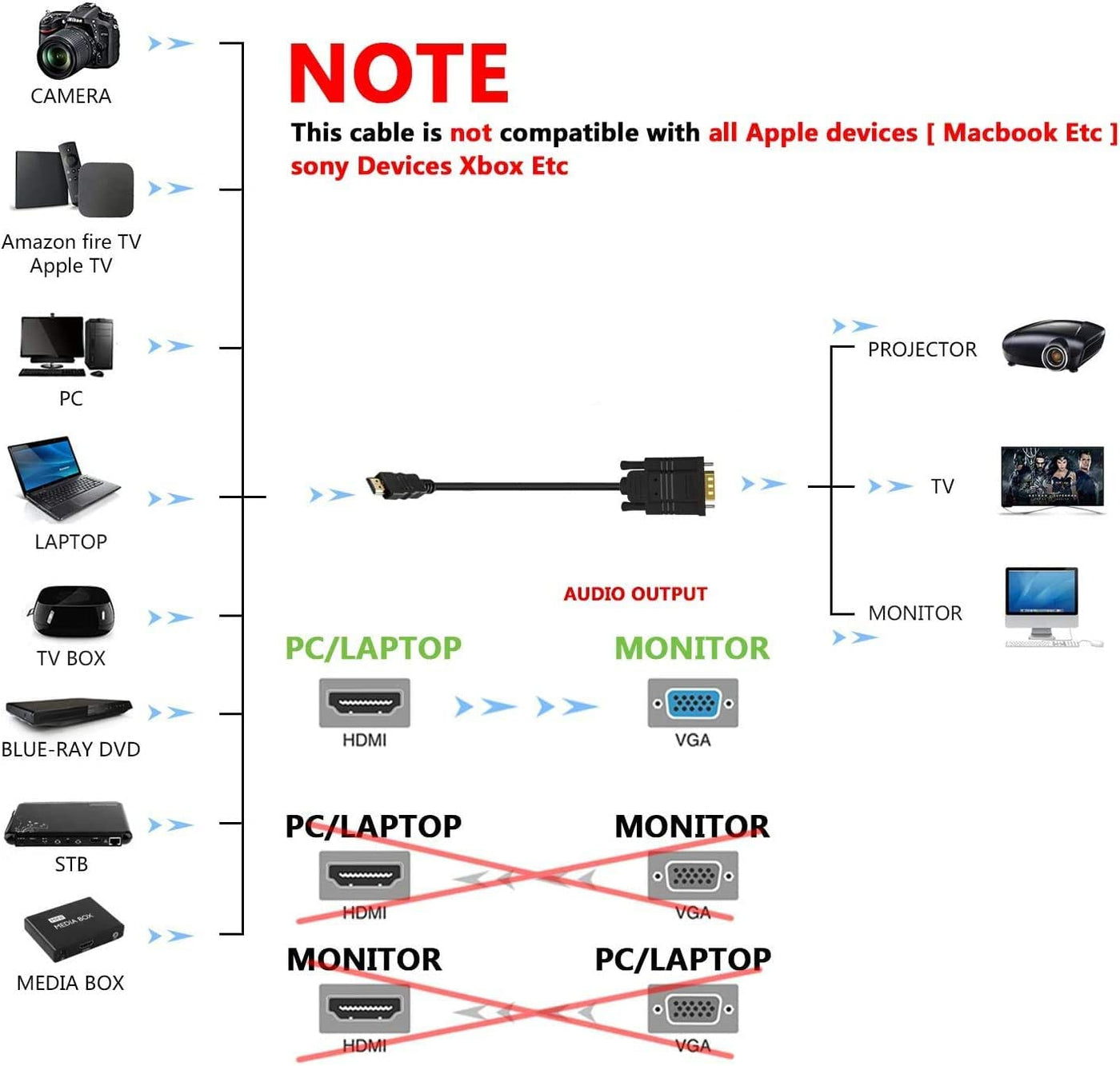 Q: What devices are compatible with the NewBEP HDMI to VGA Adapter Cable?A: The NewBEP HDMI to VGA Adapter Cable is compatible with various HDMI devices such as notebooks, PCs, laptops, DVD players, and gaming consoles like Xbox and PlayStation. It can connect to VGA devices like TVs, projectors, and monitors. However, it is not compatible with Apple Mac systems or Blu-ray players.