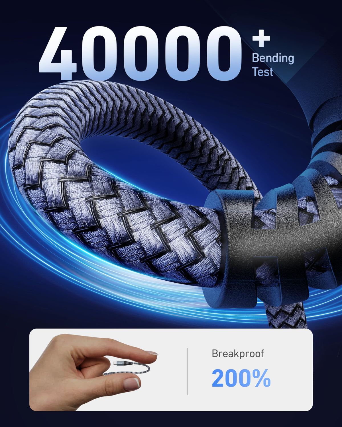 Q: How durable is the ohbox iPhone Charger cable?A: The ohbox iPhone Charger features a nylon braided surface and has been tested for over 10,000 bends, making it highly durable and resistant to wear, ensuring a long-lasting charging solution.
