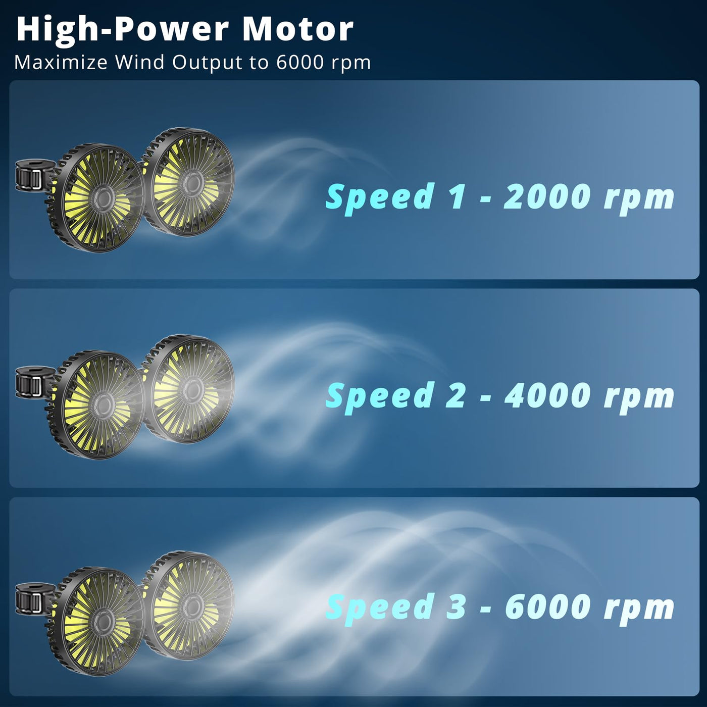 Q: What are the key features of the Ouffun Car Fan?A: The Ouffun Car Fan features dual heads with advanced 5-blade vortex technology for powerful airflow, customizable 3-speed settings, 360° rotation for optimal air circulation, a sturdy clip for easy attachment to the backseat, and a child-safe design to prevent accidental contact with the blades.