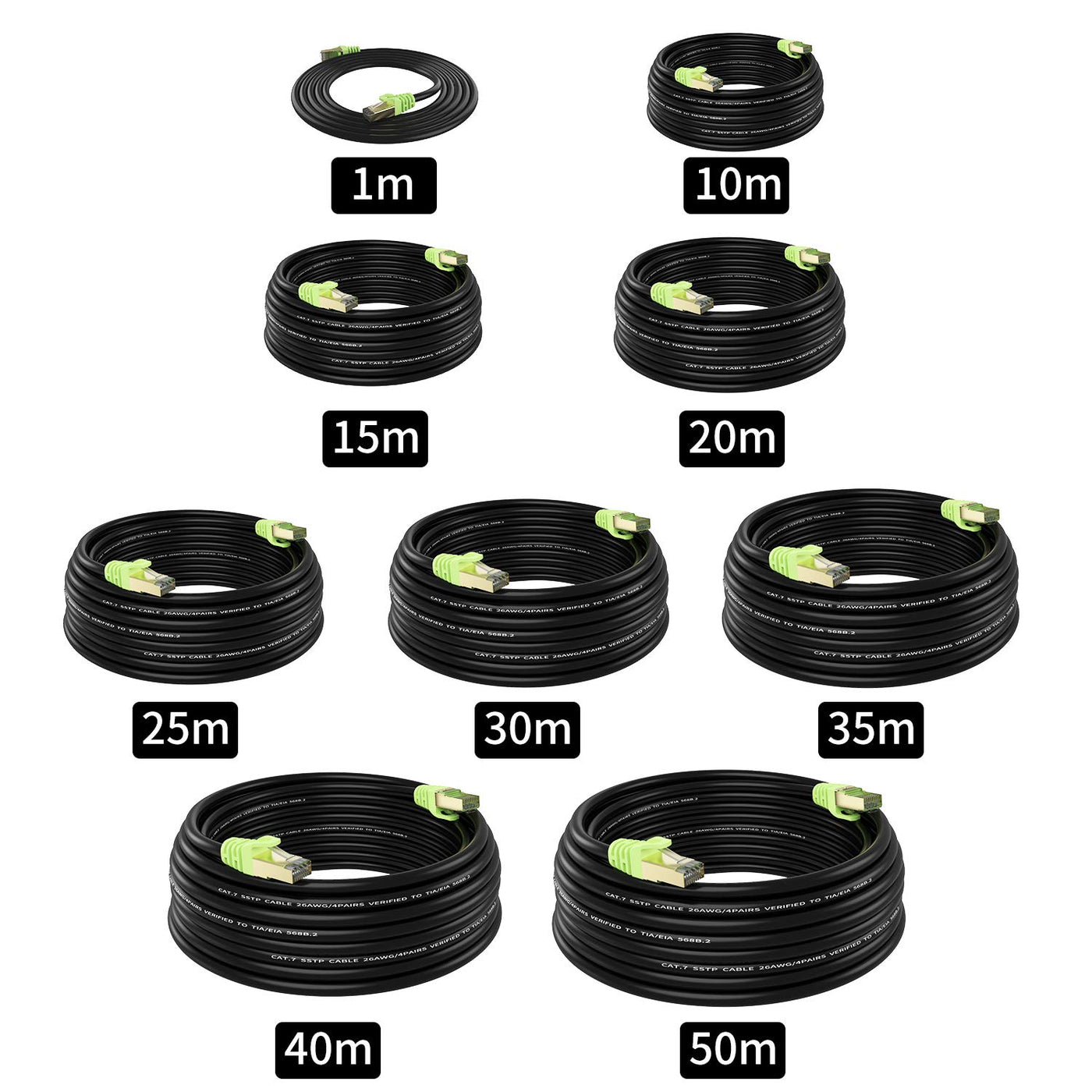 Specifications - Condition: Brand New - Data Transfer Speed: Highest Reach 10Gbps - Length: 0.5M/1M/2M/3M/5M/6M/8M /10M/12M/15M/20M/40M/50M/60M/70M/80M - Connector Type: Rj45 Cat7 - Conductors: 32Awg