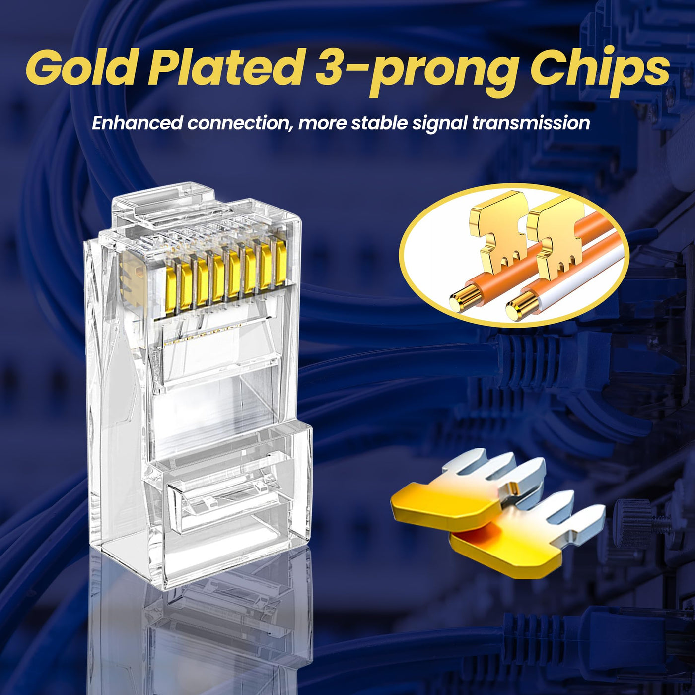 Q: Why are gold-plated chips used in these RJ45 connectors?A: The gold-plated 3-prong chips in the PETECHTOOL RJ45 connectors enhance performance by providing a tighter connection with the wire's core. This improves the stability of signal transmission, ensuring optimal performance for your Ethernet connections.