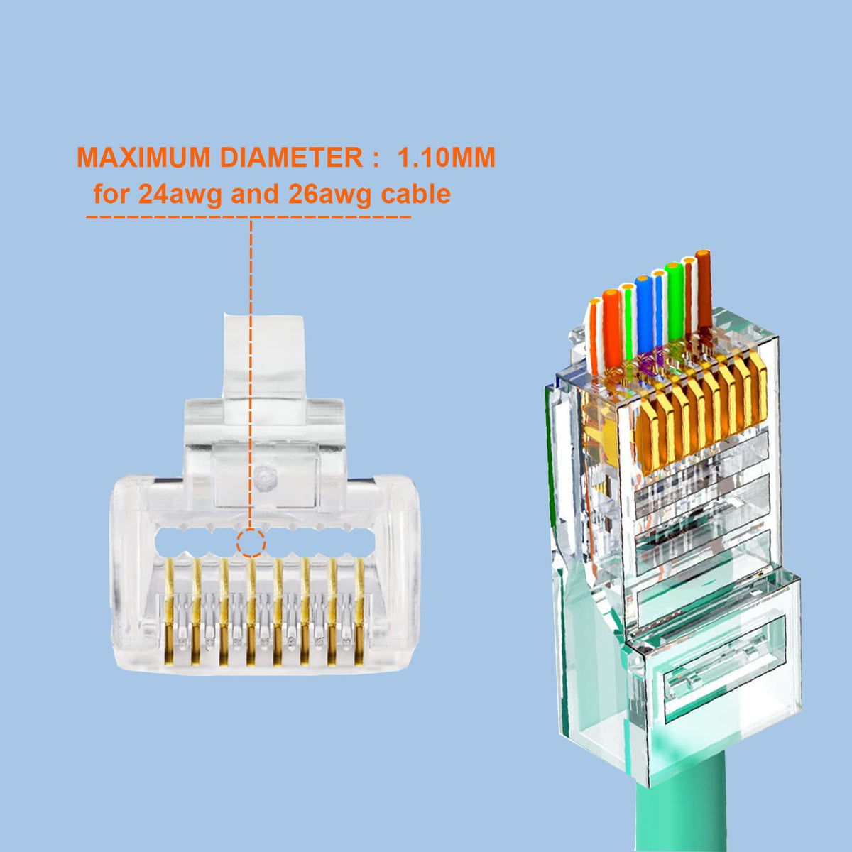 Q: How does the pass-thru design of these connectors benefit installation?A: The pass-thru design allows the wires to be fed through the connector, making it easier to verify the sequence and ensuring that the twists are pulled closer to the contacts. This enhances signal integrity and clarity.