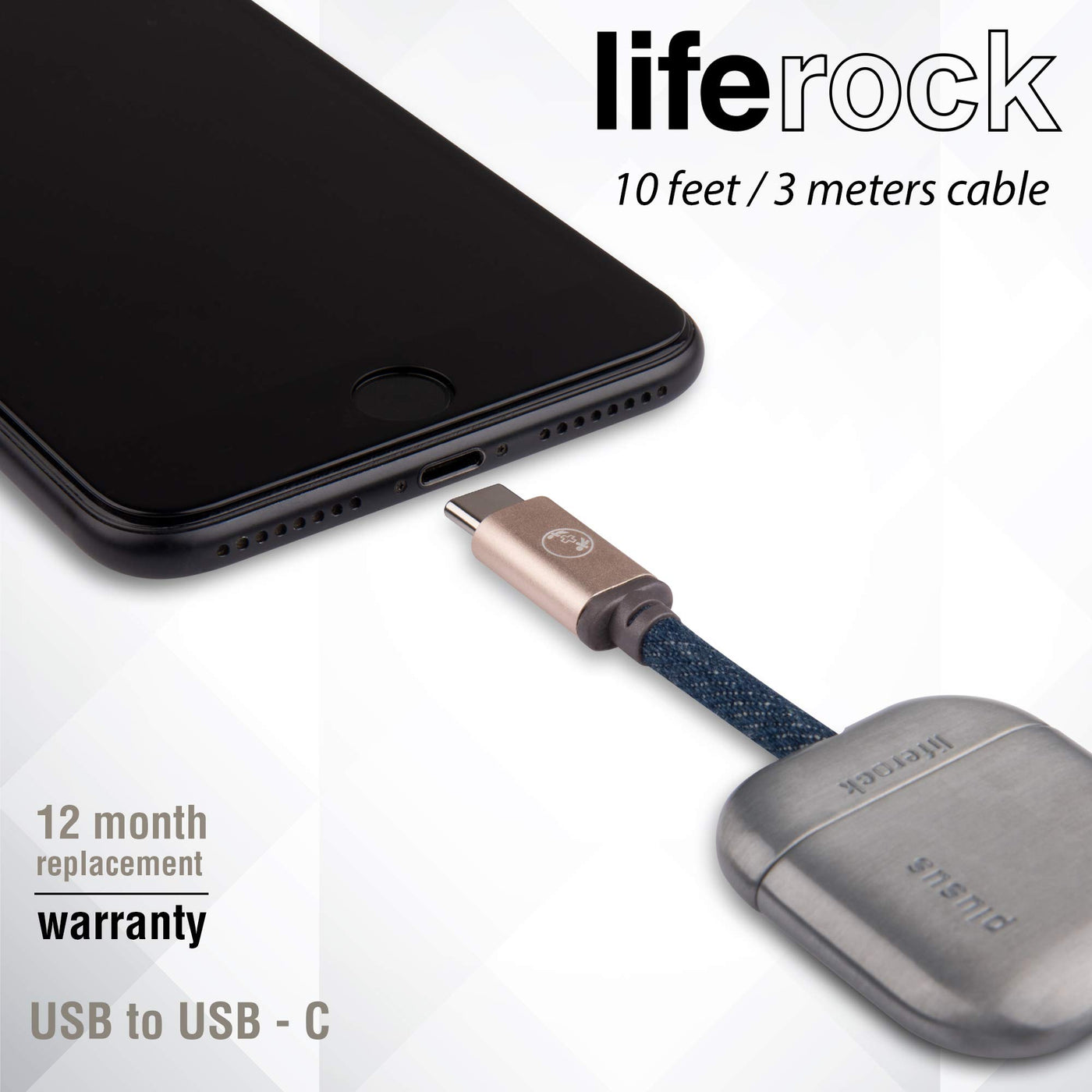 Finally, A Cable That Is Always Within Reach. At A Convenient 10 Feet (3 Meters) And Featuring A Unique Alloy Adjustable Weight, It Stays In Place Exactly Where You Left It. Quality Made Cable, Denim Material Outer - Double-Stitched For A Tangle-Free & Anti-Fray Experience. Liferock Is A Patented Australian Design. Usb-C To Usb For Your Android & Apple Devices... Sync And Fast 3 Amp Charge Rate.