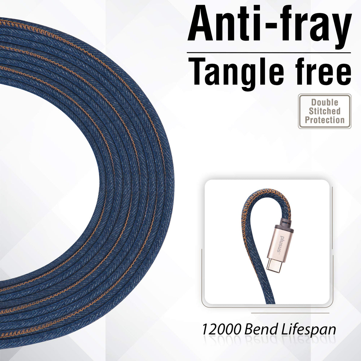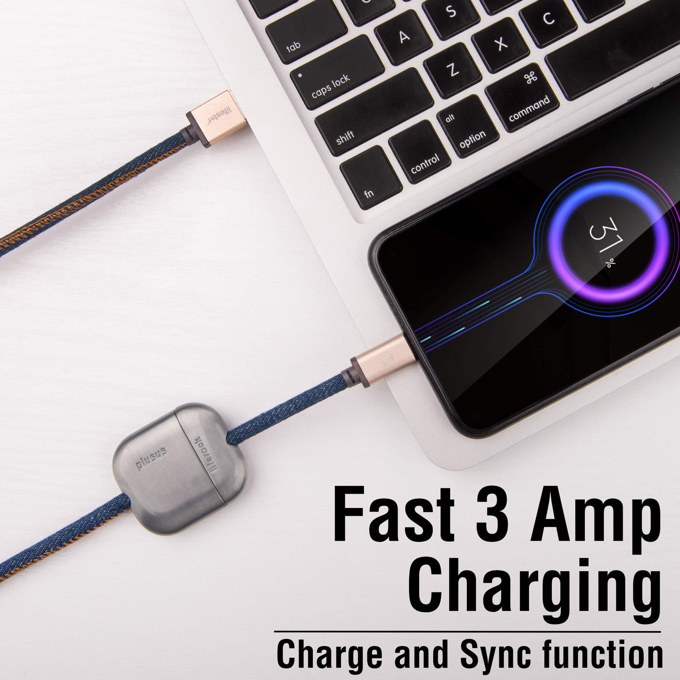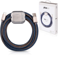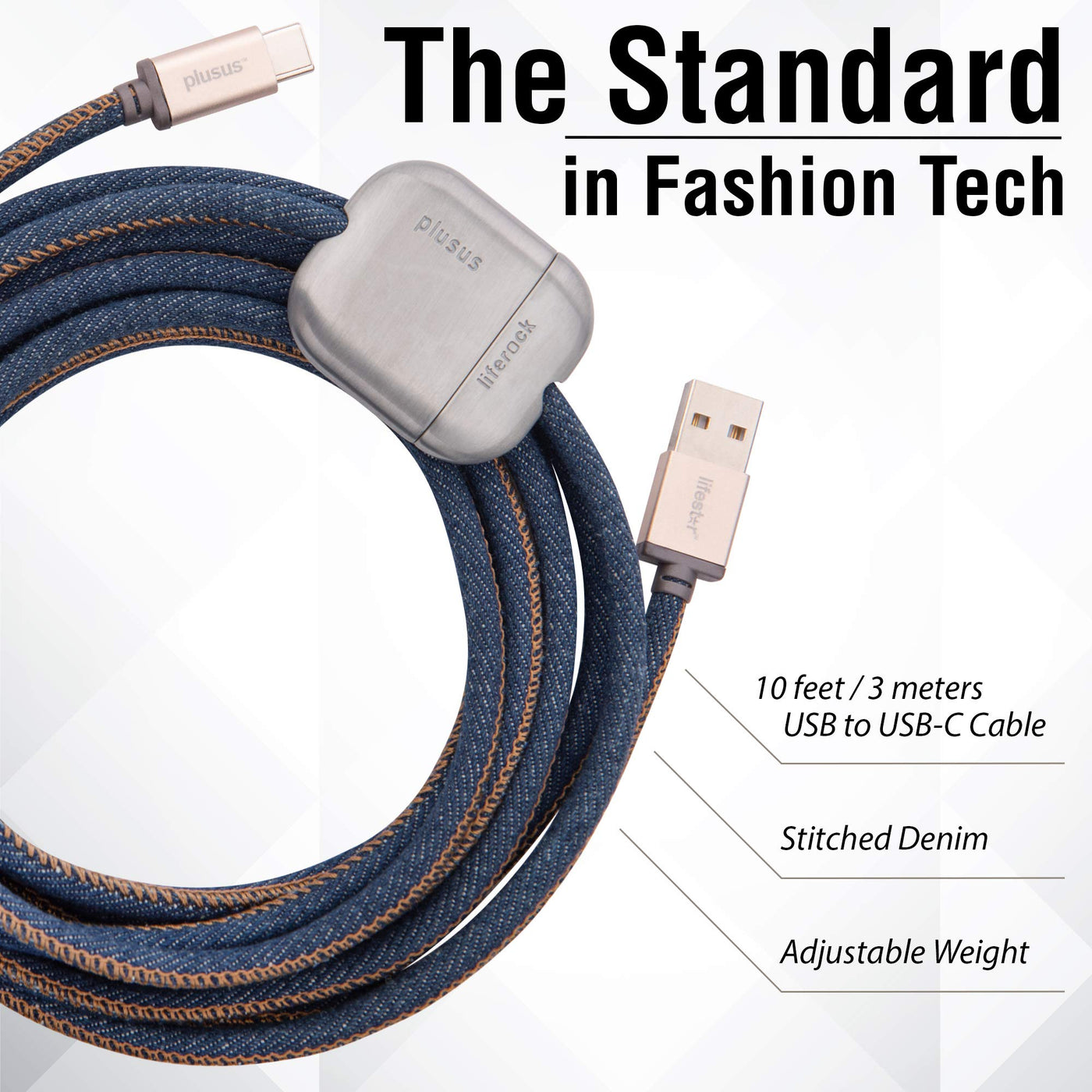Plusus Liferock 10 Ft (3M) Extra Long Usb C To Usb Cable Handcrafted In Stitched Denim Featuring An Adjustable Alloy Weight