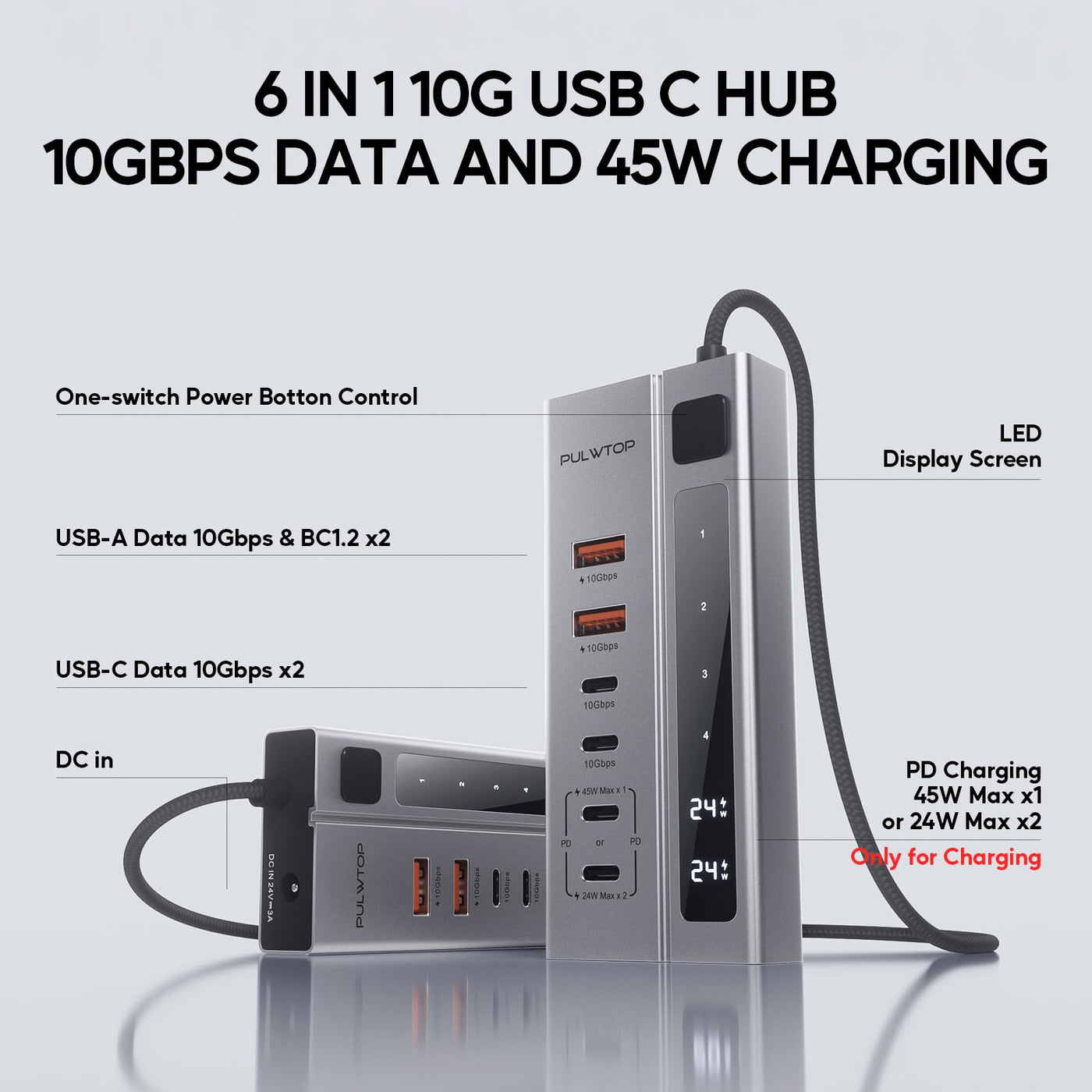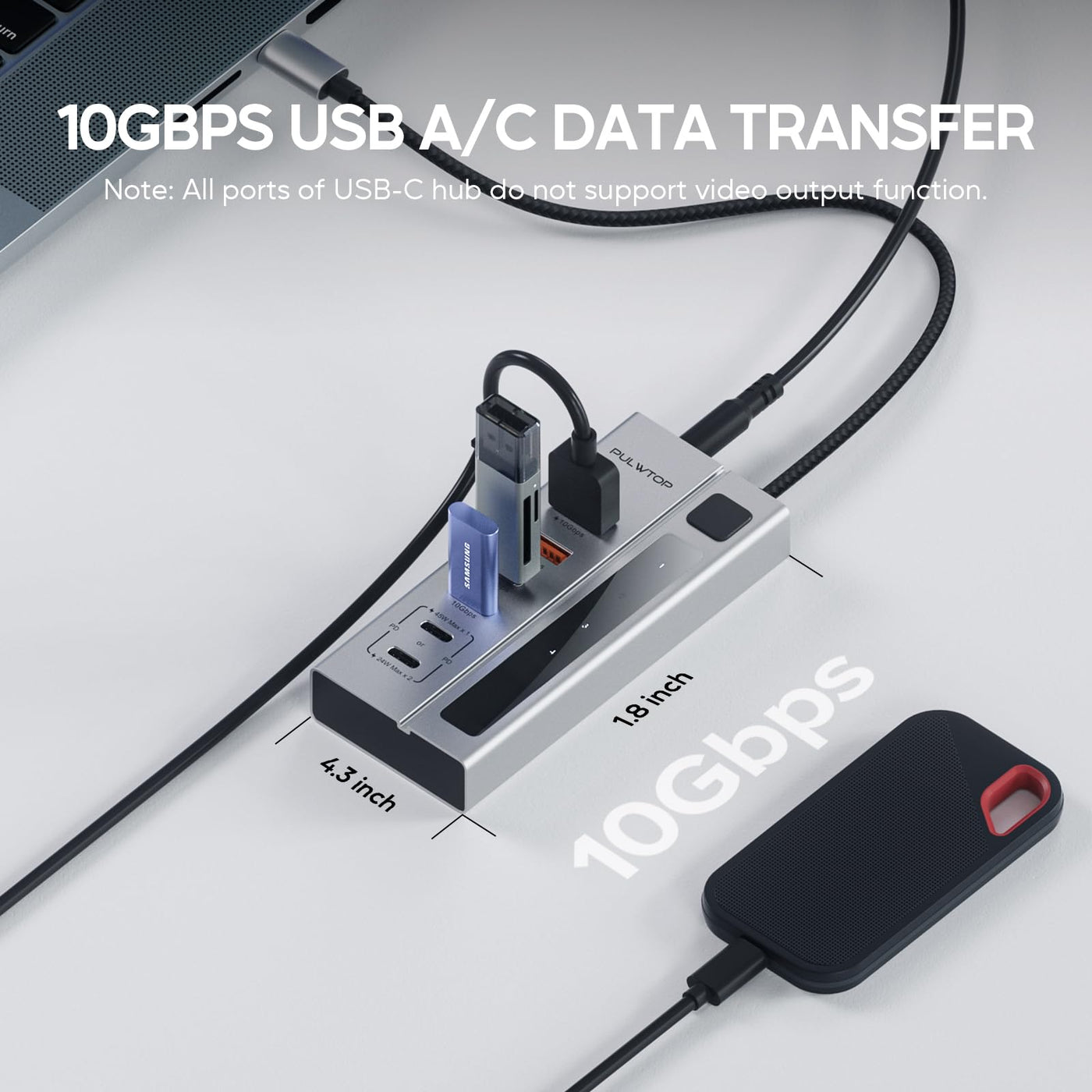 Powered Usb C Hub, Pulwtop Usb Hub Powered Support 10Gbps Data & Pd 45W Charging Not Support Video, 2Usb C 10Gbps Ports, 2Usb 3.