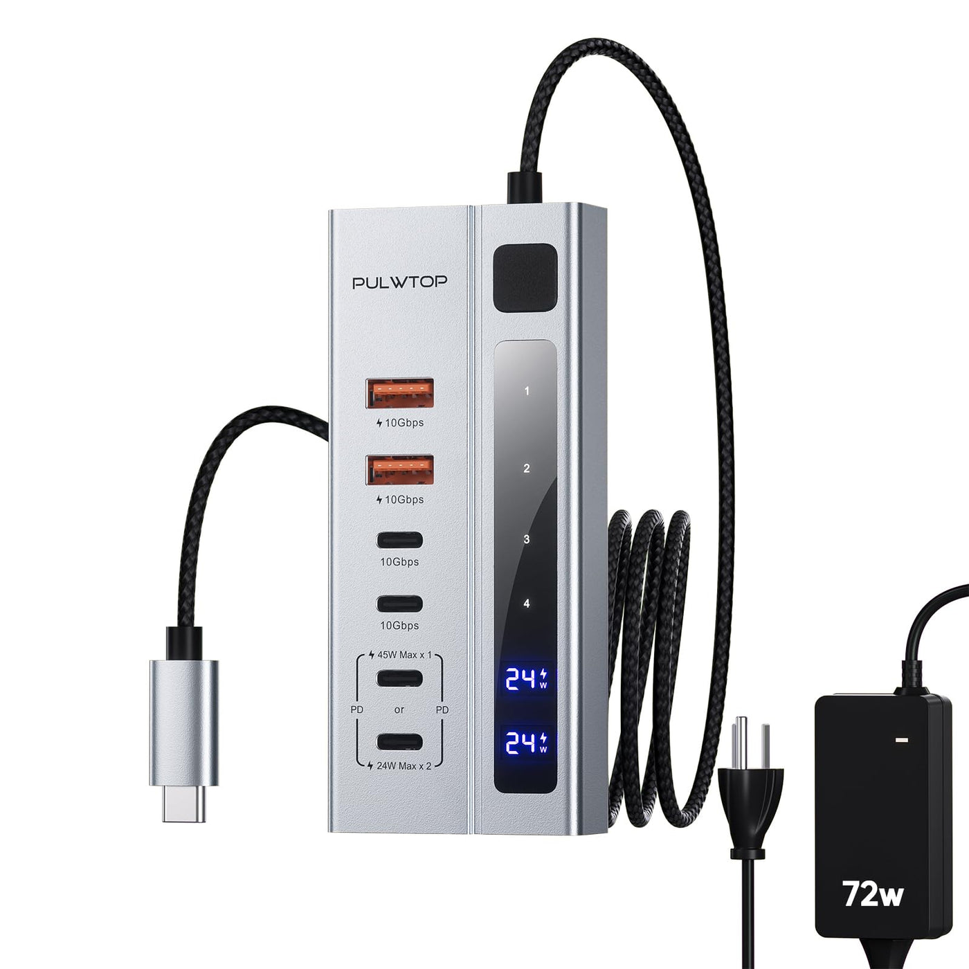 Pulwtop Powered Usb C Hub, Usb C Hub Powered Support 10Gbps Data Pd 45W Charging 3Ft Usb C Powered Hub With 72W Power Adapter For Imac, Macbook Pro/Air, Iphone, Watch, Xps Adapter (Not Support Video)