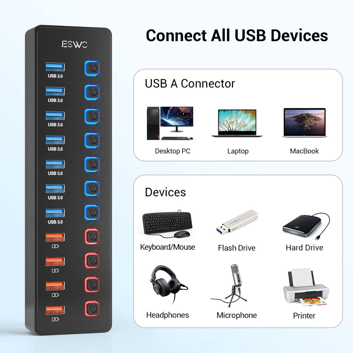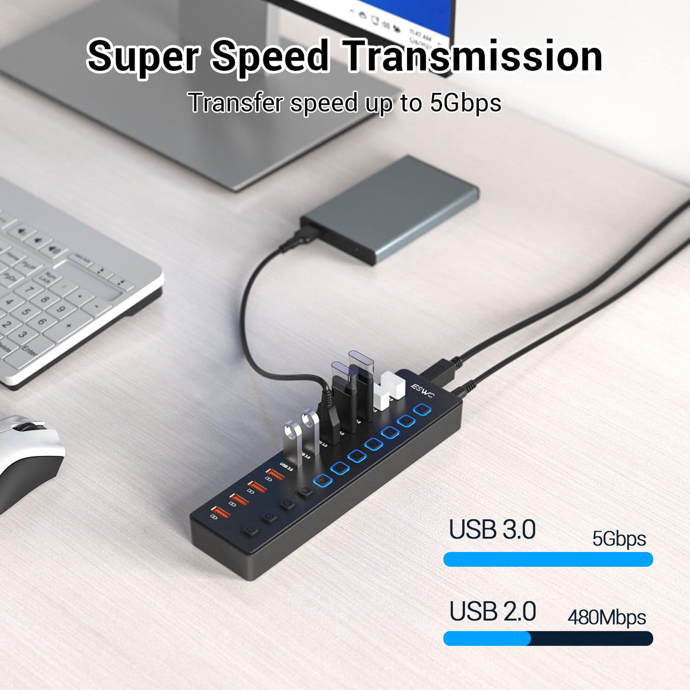 Powered Usb Hub, Jeswo 11 Port Usb Hub 3.0 Splitter (7 Usb 3.0 Data Transfer Ports + 4 Smart Charging Port), Usb Hub Powered Wit