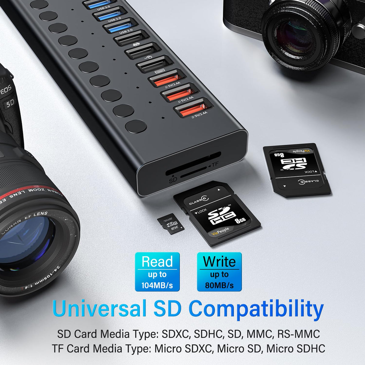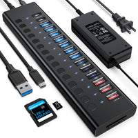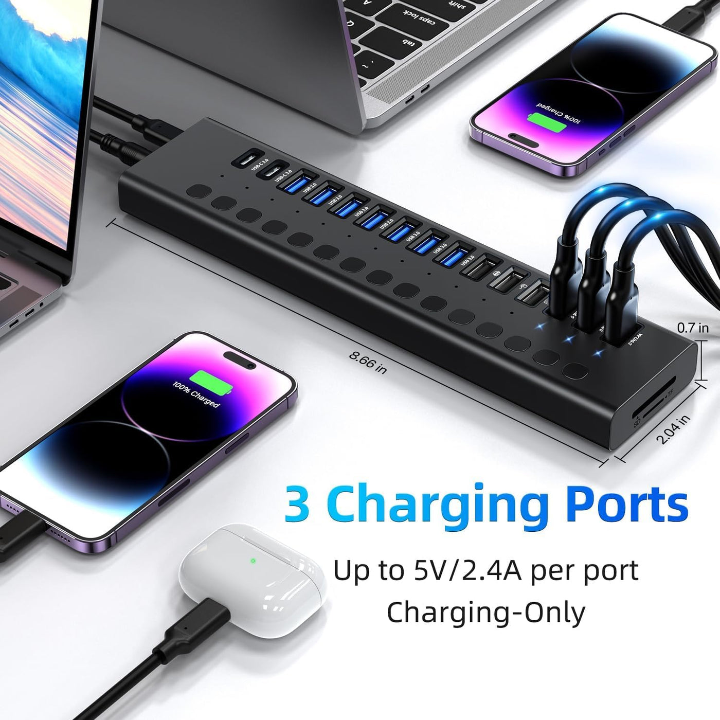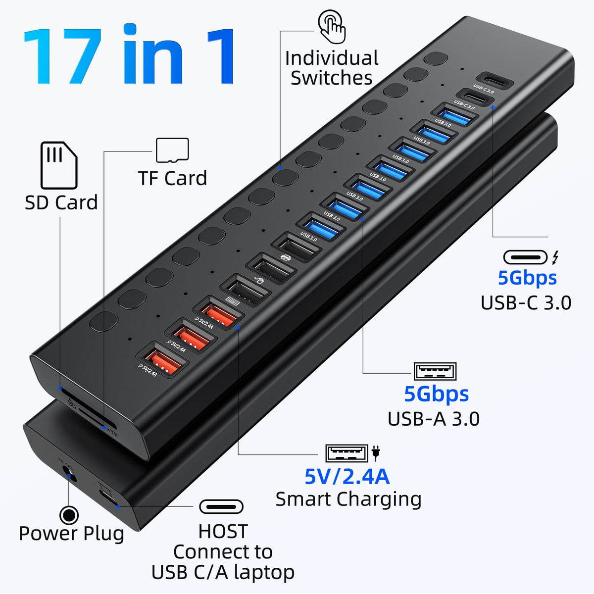 Powered Usb Hub, Vangree 17 Port Usb Splitter (7 Usb 3.0 Ports+3 2.4A Charging Ports+3 Usb 2.0 Ports+2 Usb C 3.0 Ports+Sd/Tf Car
