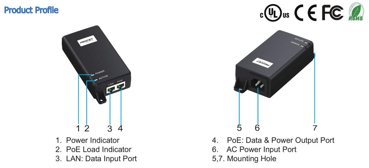 Q: Is the Procet PoE Injector compatible with previous IEEE standards?A: Yes, the Procet PoE Injector fully complies with IEEE802.3bt and is backward compatible with IEEE802.3af and IEEE802.3at standards, ensuring it can work with a wide range of PoE devices.