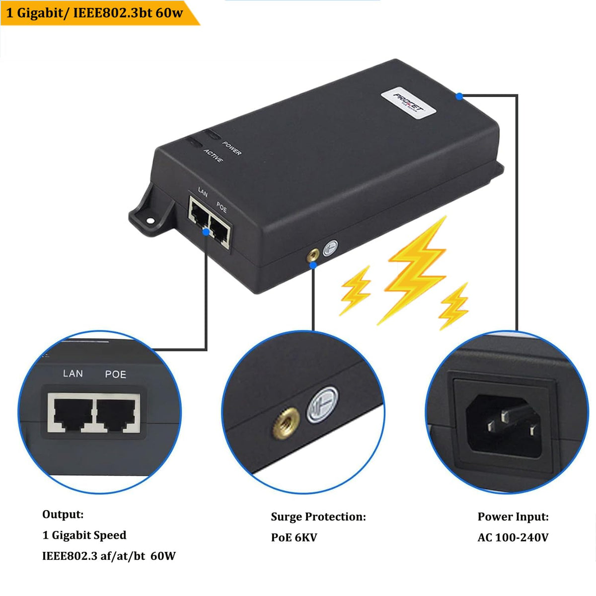 Procet Poe Injector 802.3Af/At/Bt 60W 10/100/1000Mbps Gigabit Active Poe+/Poe++ Power Supply Injector With 6Kv Surge Protection For Ip Camera, Wireless Ap, Iot, Kiosks, Pt Pse106Gw Ar