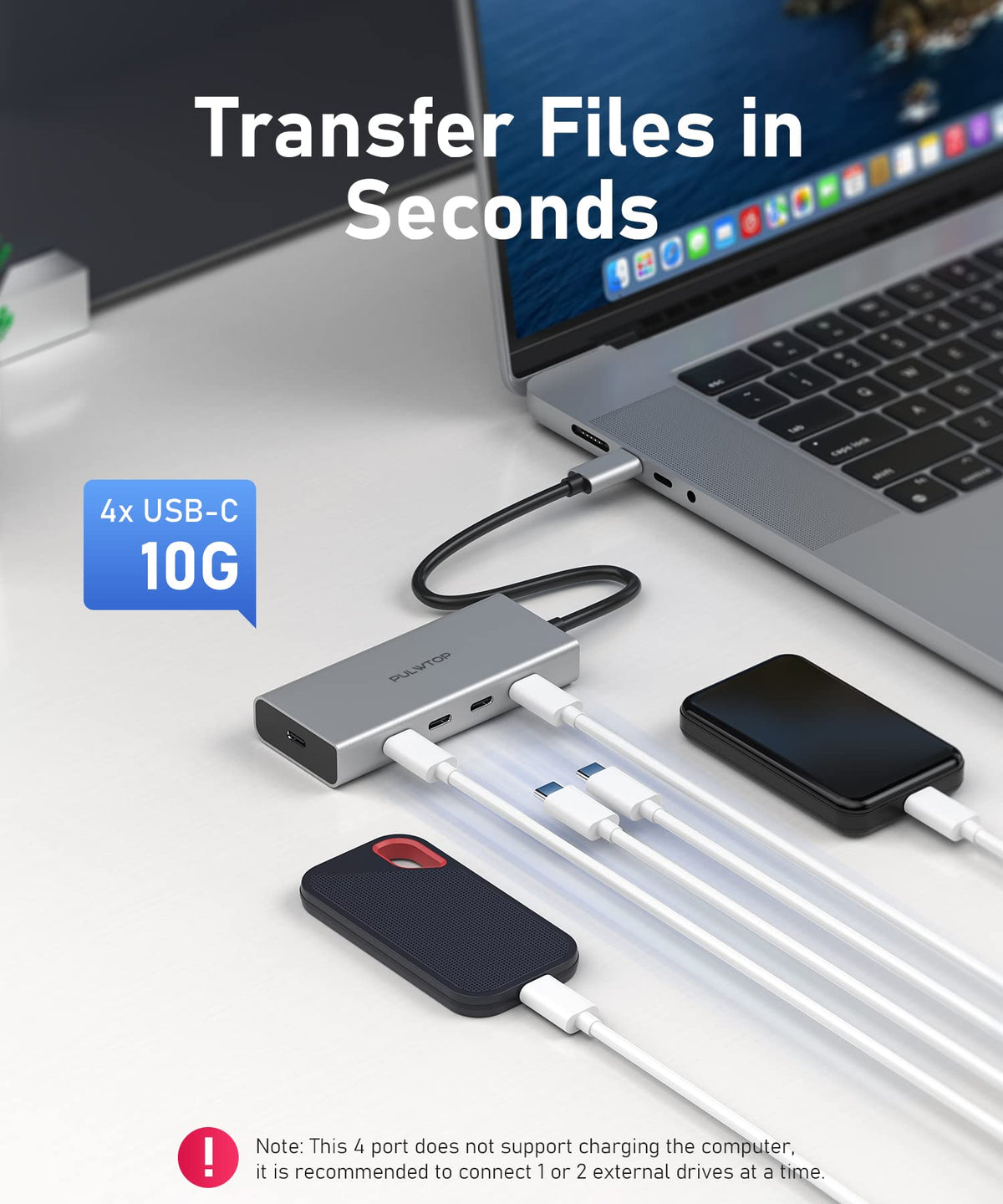 Q: What data transfer speeds can I expect from the PULWTOP 5 Port USB C Hub?A: The PULWTOP 5 Port USB C Hub supports data transfer speeds of up to 10Gbps across its four USB-C ports, allowing for quick backups and file transfers.