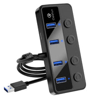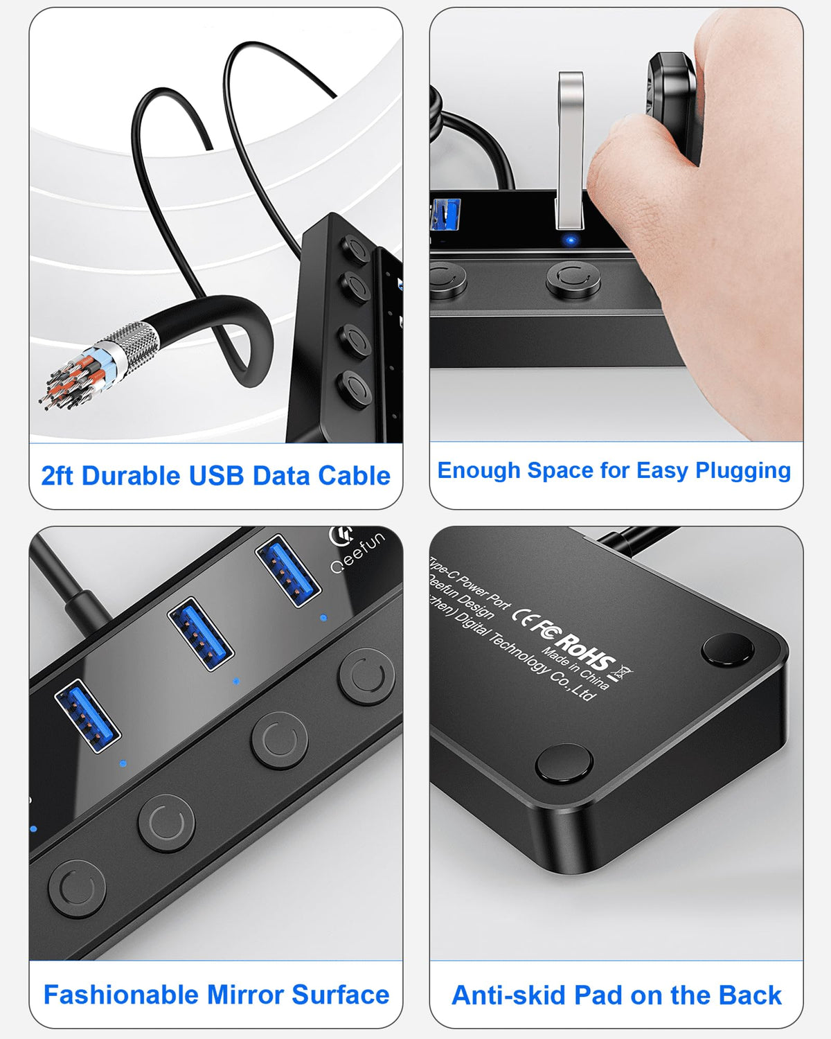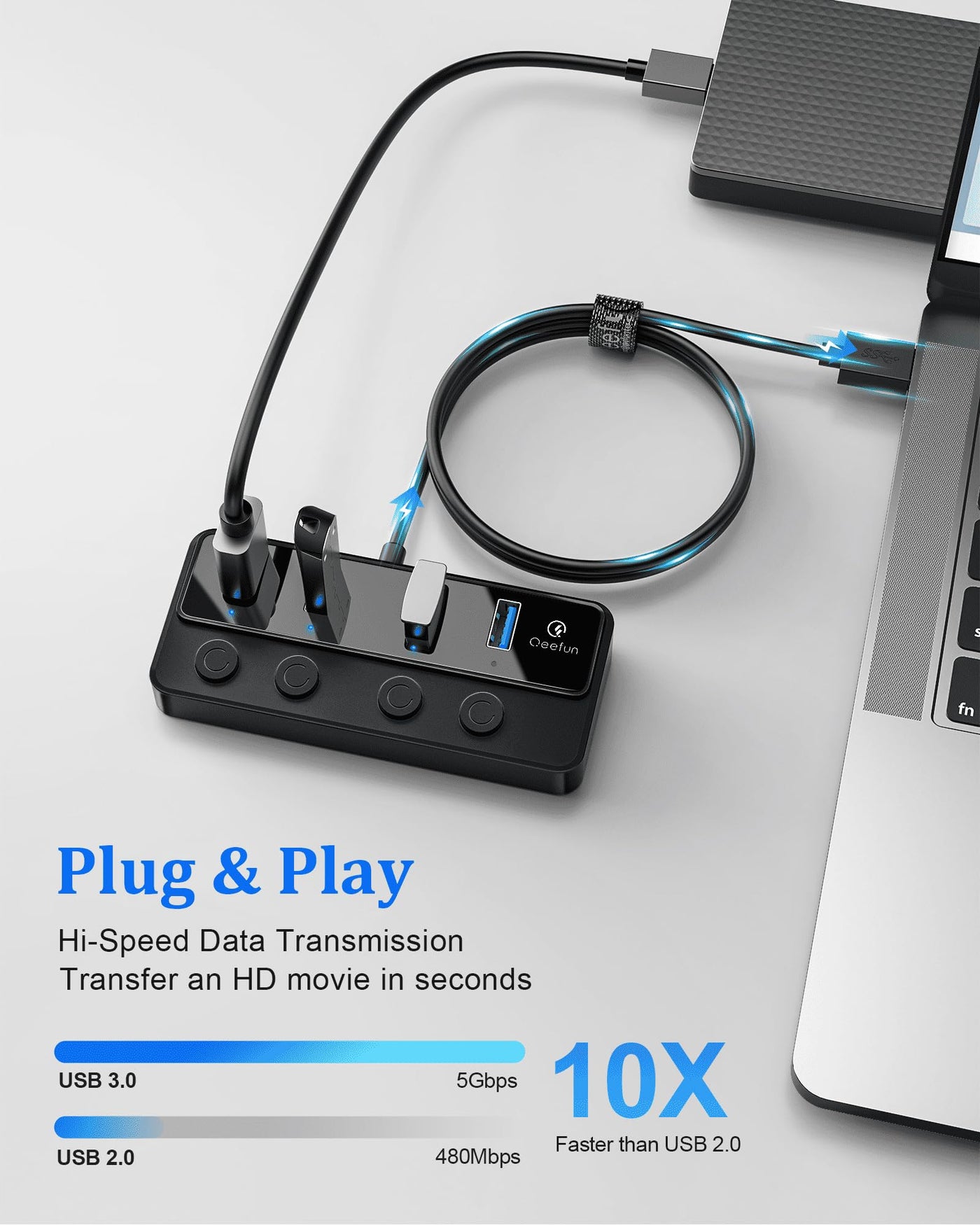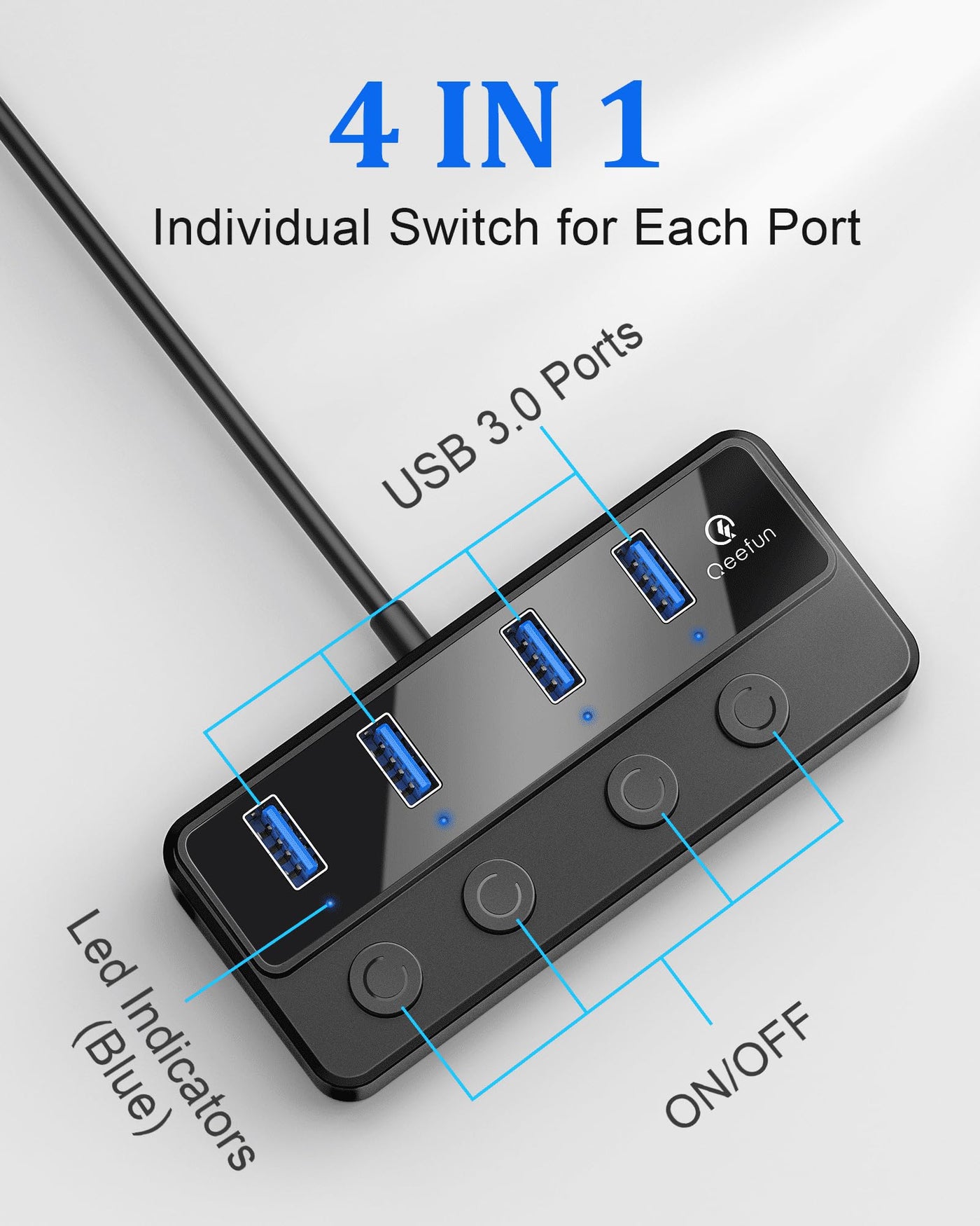 Qeefun 4-Port Usb Hub 3.0, Individual Led Power Switches Usb Splitter 2Ft Usb Extender 5V/3A Usb Adapter For Laptop, Pc, Usb Flash Drives, And More
