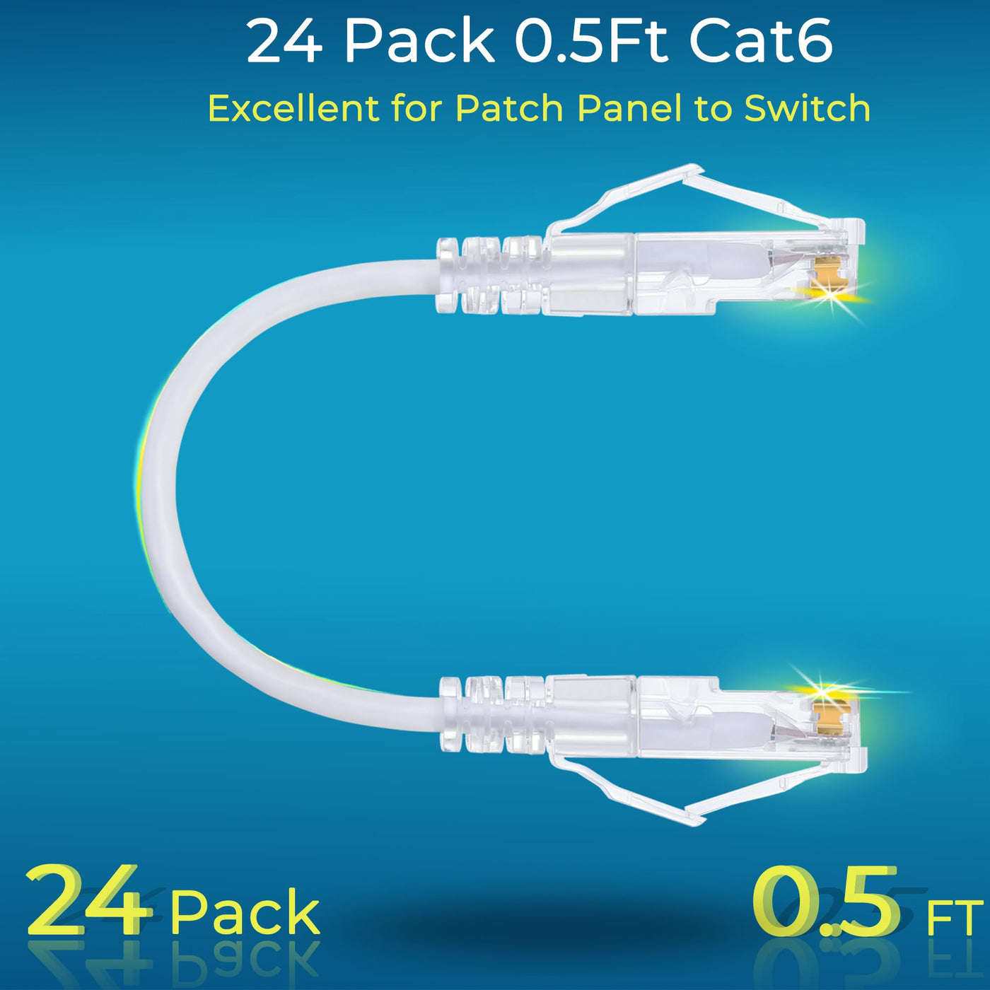Rapink Patch Cables Cat6/ Cat6A 0.5Ft (24 Pack) Slim, Cat6A Ethernet Patch Cable 10G Support, Snagless Cat 6 Patch Cable For Patch Panel To Switch, Flexiable Cat6 Ethernet Cable White
