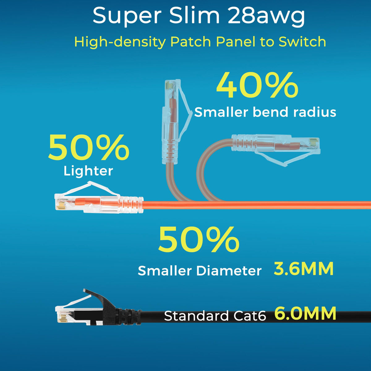 Q: What is the significance of the 28 AWG in these patch cables?A: The 28 AWG (American Wire Gauge) indicates a thinner cable design, which is at least 50% smaller in diameter compared to standard 24 AWG cables, making it easier to manage and route through tight spaces.
